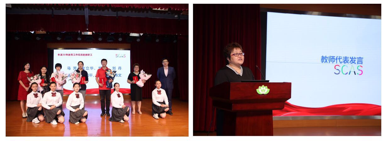 乔蔓菁书记代表学校向年满30年教育工作经历的马芳、戈立华、李元、刘丹、杨洪欣、范和平、胡晓虹、蔡伟文八位老师颁发荣誉证书。蔡伟文老师发表感言:30年从教对每一个教师而言,都是一个光荣的里程碑。选择不后悔,且行且珍惜。做一个温暖的人,因为被学生需要的感觉真好。