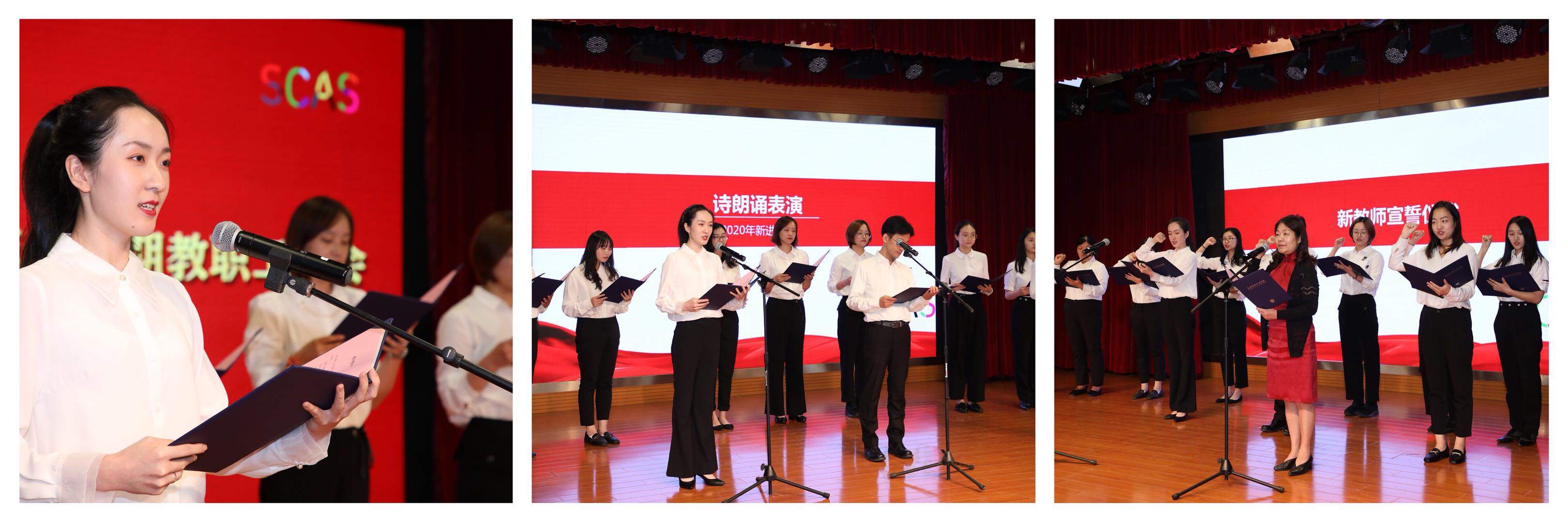今年刚入职的十三名新商会人依次亮相做自我介绍,并献上了一首配乐诗朗诵。接着,在王洁副校长的领誓下,新进教师们进行了庄严的入职宣誓。