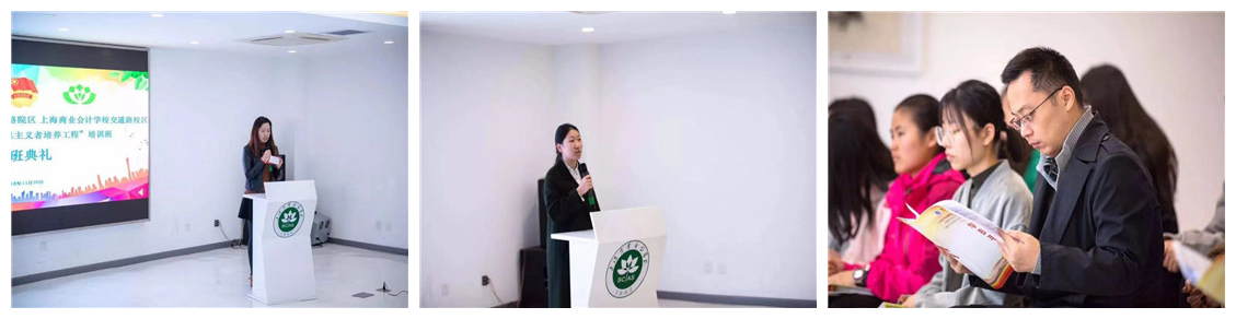 2018年11月20日中午12:00,上海商学院高等技术学院交通路院区、上海商业会计学校交通路校区“青年马克思主义者培养工程”第三期培训班开班仪式在白楼三楼学生活动中心放映厅如期举行。 此次典礼很荣幸邀请到上海商学院高等技术学院交通路院区副主任、上海商业会计学校副校长王洁,交通路院(校)区办公室主任范荣,交通路院(校)区办公室副主任周妍,交通路院区综合党支部书记张玲以及辅导员老师和青马培训班学员,同时还邀请了超星公司软件为此次课程的线上教学进行指导。本次开班典礼由交通路院区团委书记、商会校团委副书记陆瑞雯老师主持。