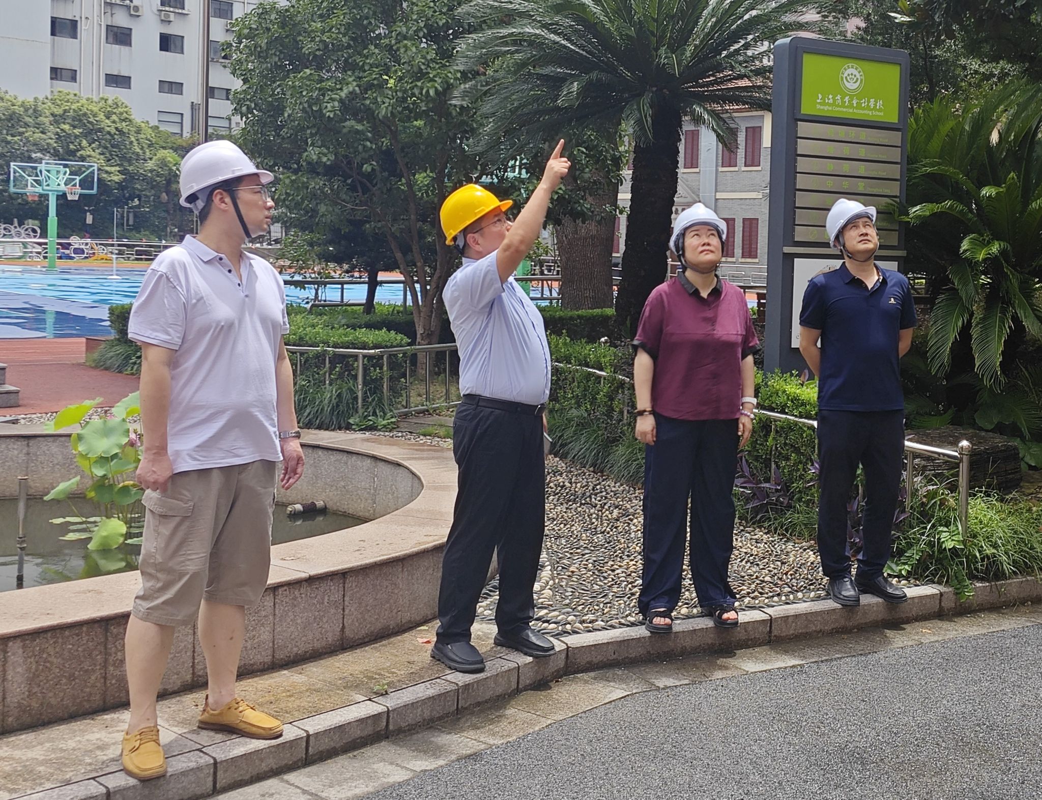 近日,为切实保障学校暑期工程项目有序推进,校长杨菁,党委书记陈震,副校长张志华、钱亮于共同前往黄浦、普陀两个校区多个修缮工程现场,实地勘查工程进展,并对施工安全及防台防汛等关键环节作出重要部署。后保科、普陀校区办相关同志全程陪同检查。