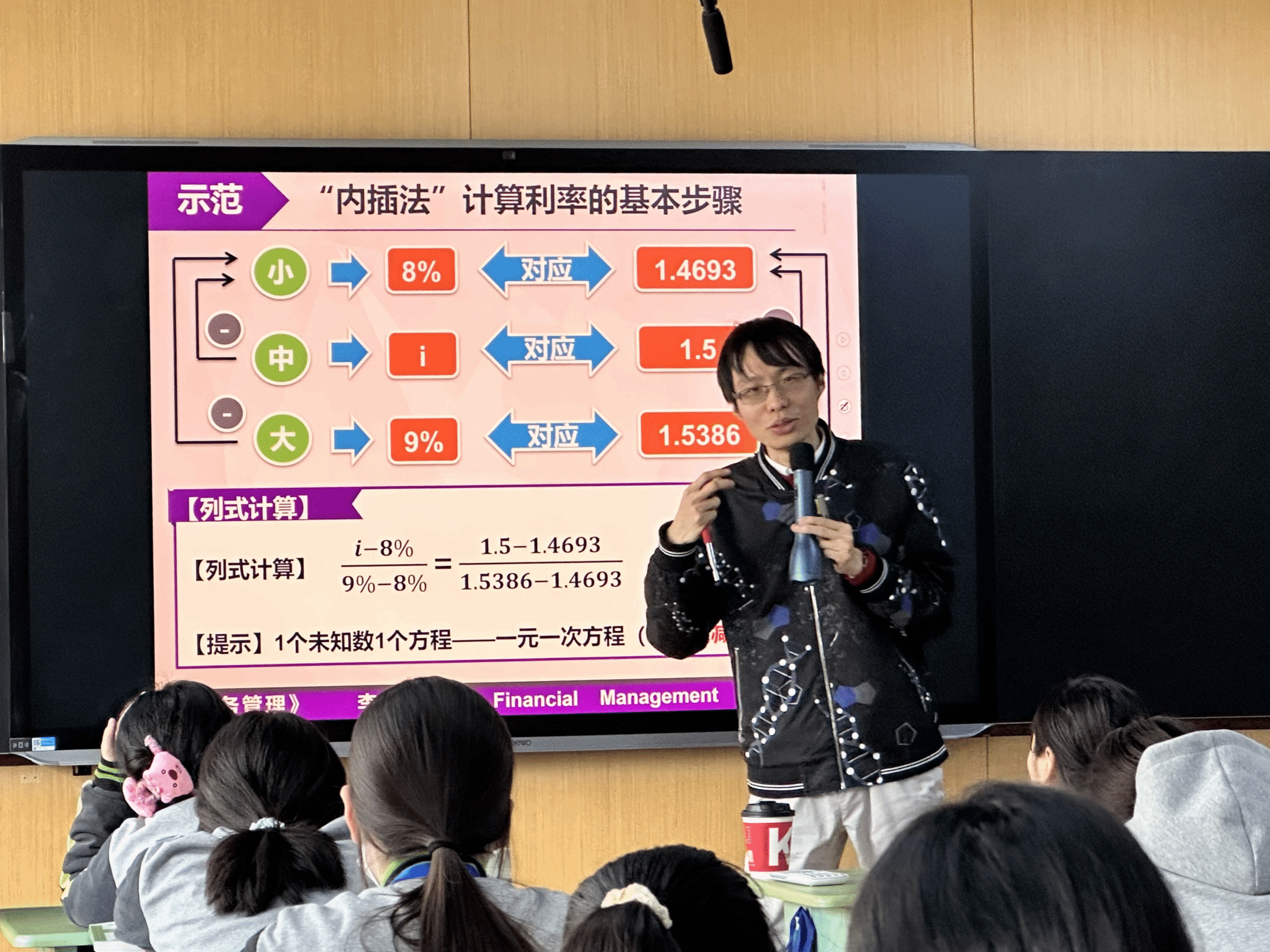 近日,用友冠名班 23 年级 1 班的财务管理课堂上,李宇超老师以 “内插法计算利率” 为主题,呈现了一堂兼具知识性与实操性的精彩示范课。王莉萍老师带领工作室成员吴依伦老师和李亮子老师一同观摩。课程结束后,所有老师再次重温了课程精彩片段,并进行了一场热烈而深入的评课交流活动。