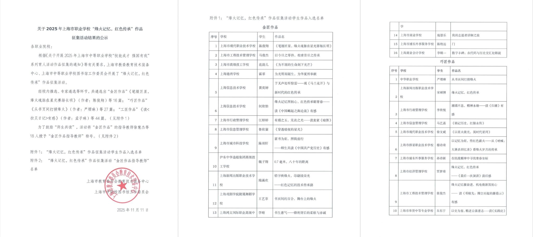为深入贯彻落实“技能成才、强国有我”的育人理念,上海市教委教育技术装备中心、上海市中等职业学校图书馆工作委员会于9月组织开展了“烽火记忆、红色传承”主题读书及作品征集活动,我校师生积极参与其中并取得了丰硕成果,共斩获包括“金匠作品”在内的三项大奖,彰显了我校德技并修的育人成效。