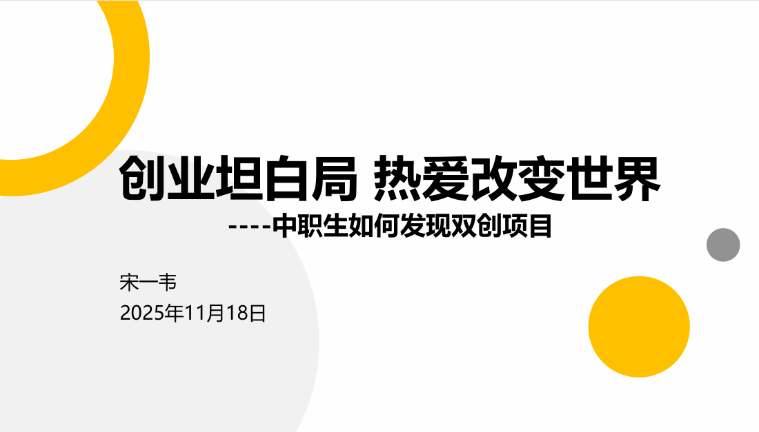 第一讲以“创业坦白局——中职生如何发现双创项目”为主题,宋一韦老师通过生动鲜活的案例与实用有效的技巧,为学子们带来了一堂接地气、有温度的创业启蒙课。讲座紧密从中职生实际情况出发,提出依托专业优势、洞察日常痛点和把握行业趋势三条路径,鼓励发展“小而美”的细分项目。