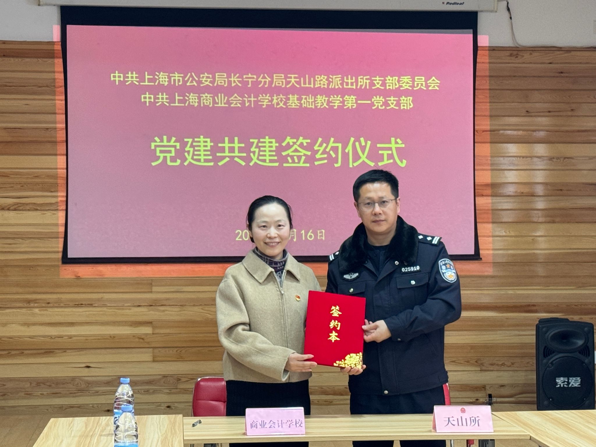 为深入贯彻党的二十大及历届全会精神,探索新时代基层党建创新路径,深化学校与社区协同联动,2026年1月16日,上海商业会计学校基础教学第一党支部与上海市公安局长宁分局天山路派出所党支部正式开展共建活动。双方以党建为引领,聚焦资源共享、优势互补,通过实地观摩、需求对接、协议签约等环节,奏响了校社共建、服务民生的新篇章。