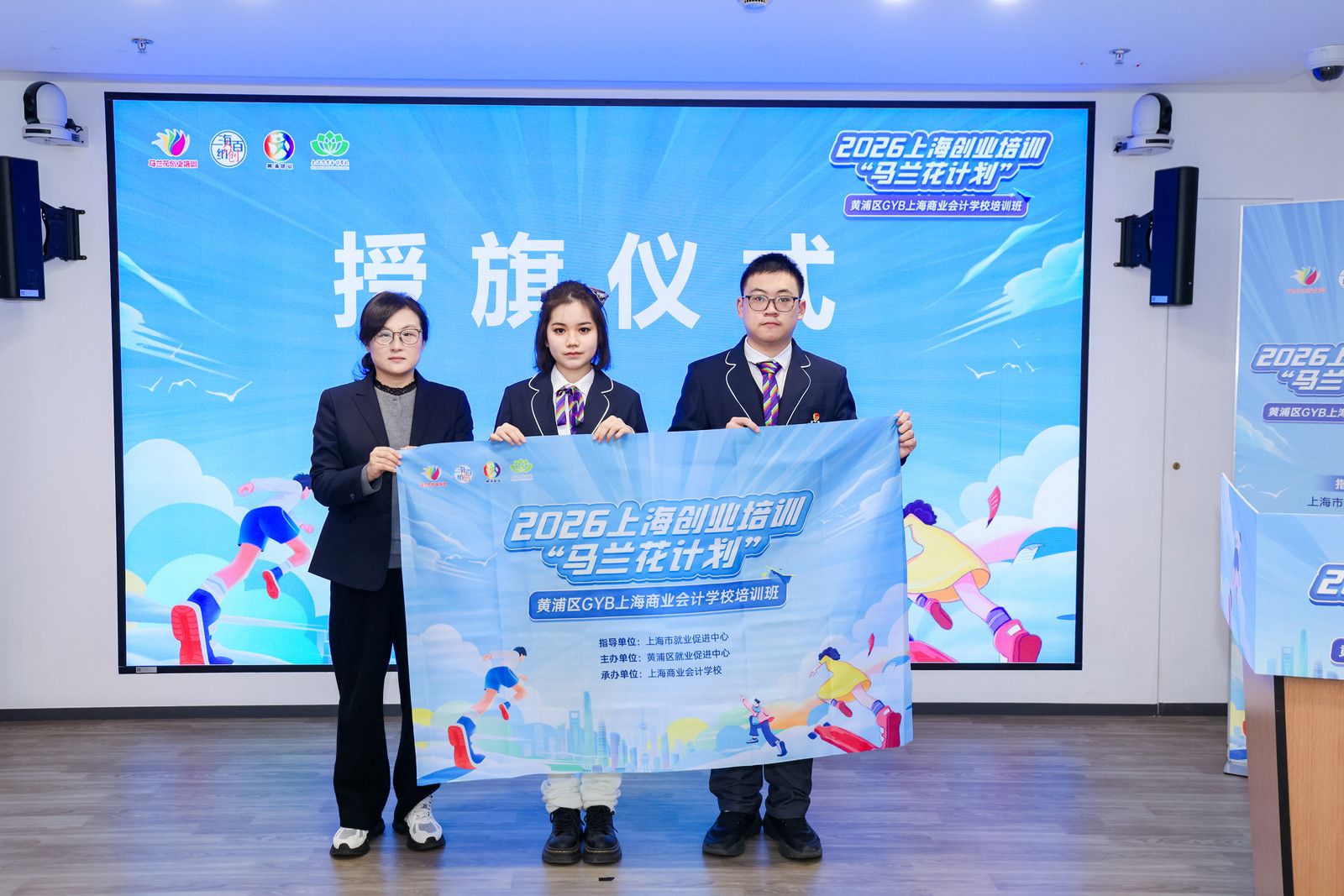 黄浦区就业促进中心副主任宣晨为培训班学员代表授予旗帜,这不仅象征着培训的正式开始,更承载着对学员们的期望与鼓励。旗帜飘扬,寓意着学员们将在创业的道路上扬帆起航。