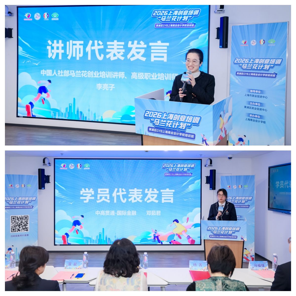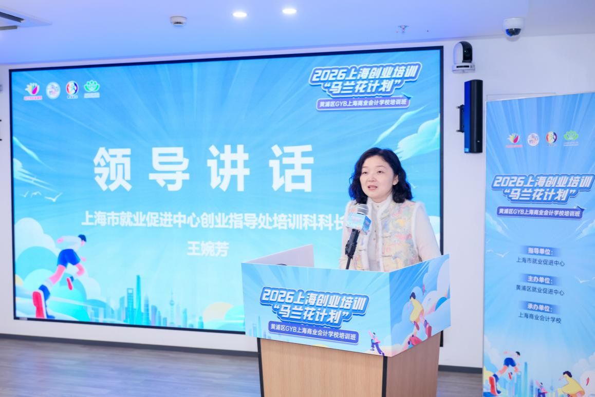 上海市就业促进中心创业指导处培训科科长王婉芳在讲话中对上海商业会计学校和学校的创业指导站工作取得的进展表示肯定,对承办本次培训活动表示感谢。她表示,市就促中心始终把支持青年创业作为重要使命,不仅搭建了 “马兰花计划”的专业培训平台,更整合了政策扶持、资源对接、导师陪伴、项目孵化等一系列全链条服务。从 GYB到SYB、IYB进阶指导、从创业补贴、场地支持等政策红利,到创业指导专家志愿团的一对一帮扶,市就促中心将会全程为大家保驾护航,让同学们的创业之路走得更稳、更顺。