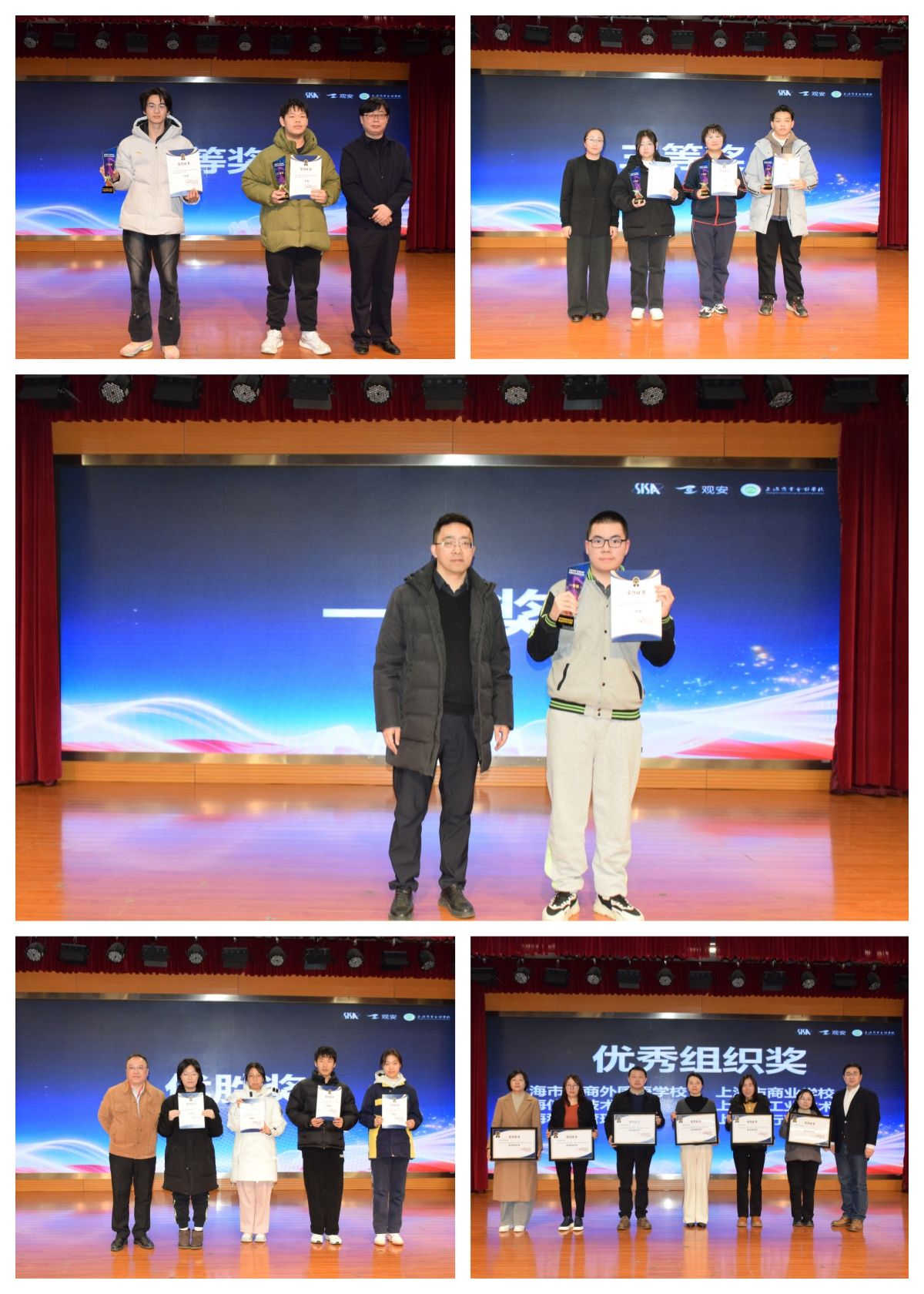颁奖典礼现场,与会领导和嘉宾为在竞赛中表现突出的学生颁发奖项,对同学们在比赛中的努力与成绩给予充分肯定。党委书记陈震为上海市工商外国语学校、上海市商业学校、上海信息技术学校、上海市工业技术学校、上海科技管理学校、上海市行政管理学校颁发优秀组织奖。