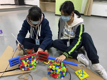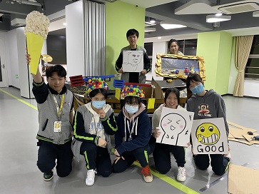 蒯家雯:我们的队员今年都是第一次参赛,对赛题要求制作的道具都特别用心。有一次,我们做了一顶非常“特别”的厨师帽,五颜六色、都是积木,上面用瓦楞纸板做成厨具作装饰,还挂上两个牌子以显示身份。结果,“厨师帽”惨变“清朝格格”,成为了社团的黑暗吉祥物。还有一次,我们花费九牛二虎之力做成一个宝箱,那时的自豪和珍惜还历历在目,万万没想到,在备赛中它不仅是参赛道具,还成为了工作室的储物柜。