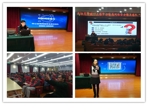 近日,学校特地邀请了上海市公安局网管中心的两位警官给同学们讲解关于网络安全与防护、拒绝网络暴力等专题的知识。学校经贸一部和经贸二部的18级学生共计300多人参加了本次专题讲座。