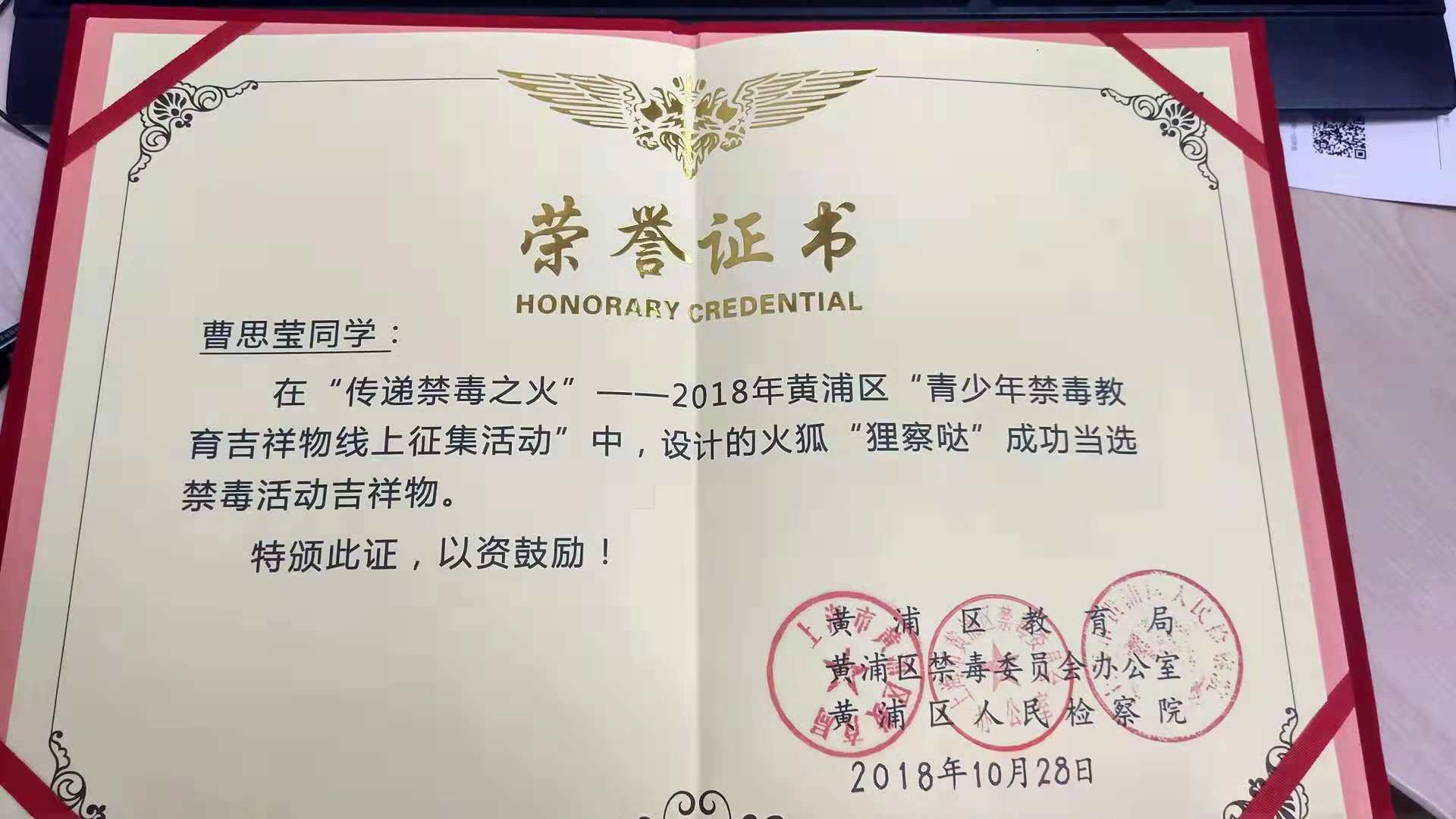 近日,一份沉甸甸的荣誉证书被送到我校,在黄浦区教育局、黄浦区禁毒委员会办公室和黄浦区人民检察院等单位组织的“传递禁毒之火”——2018年黄浦区“青少年禁毒教育吉祥物线上征集活动”中,我校信息技术教学部2961701班曹思莹同学设计的火狐“狸察哒”成功当选为禁毒活动吉祥物。