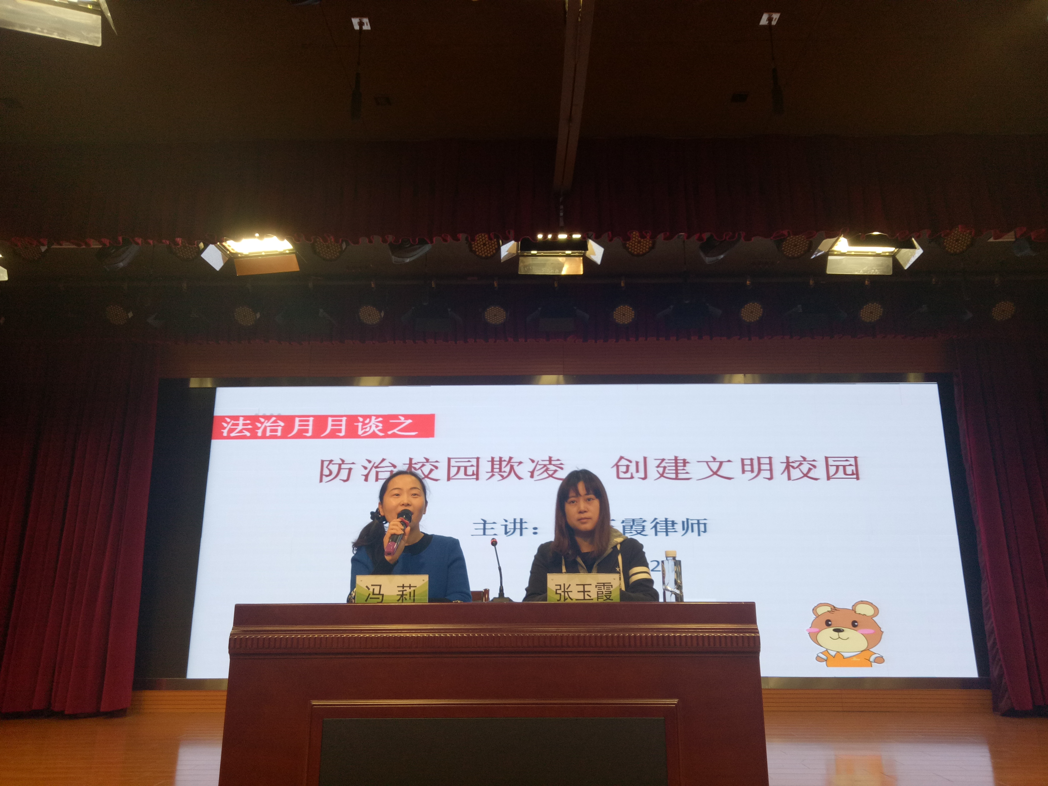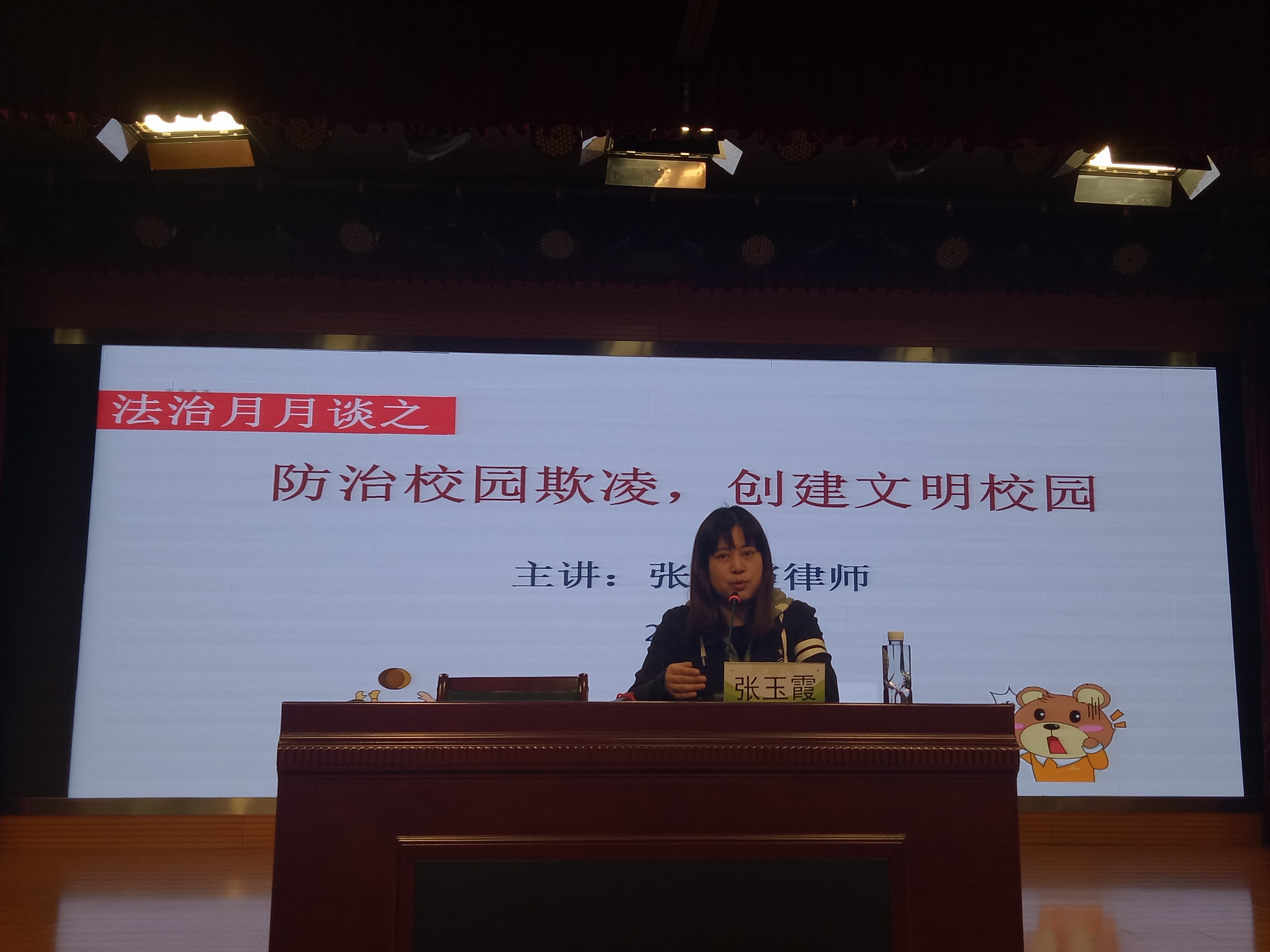 近年来,校园暴力、校园欺凌事件屡见不鲜。为进一步加强我校学生法治教育,预防校园欺凌事件的发生,10月23日中午12:00~13:00,在陆家浜路校区一号楼四楼小礼堂开展了一场主题为“防止校园欺凌,创建文明校园”的法治专题讲座,我校部分18级新生和班主任共计200余人参加了本次法治月月谈活动。本次讲座由上海市著名律师——上海申浩律师事务所张玉霞律师主讲。