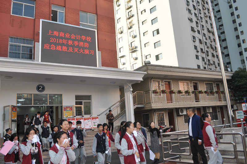 施汉忠副校长宣布“上海商业会计学校2018年秋季消防疏散演习”正式开始。工作人员随即拉响消防警报。各楼层的引导老师立刻启动疏散预案,迅速引导学生以湿毛巾捂嘴,身体前倾,并从规定的消防疏散通道有序撤出教学楼。 由于准备充分,引导有力,1522名学生在警报响起后的3分50秒内全部安全撤离至指定集合地点,演习取得圆满成功。