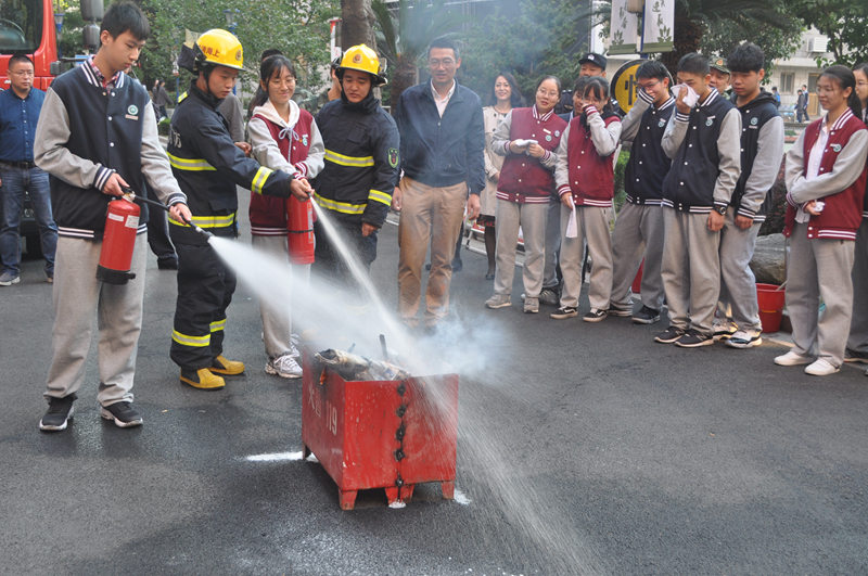 演习结束后,2018级的部分新生在复兴中路消防队官兵和半淞园路派出所民警的指导下,认真学习了灭火器的使用方式,并在消防官兵的带教下尝试用灭火器扑灭火苗。演习现场,同时开展了《消防安全知识》和《校园安全法制知识》的展板宣传教育活动。