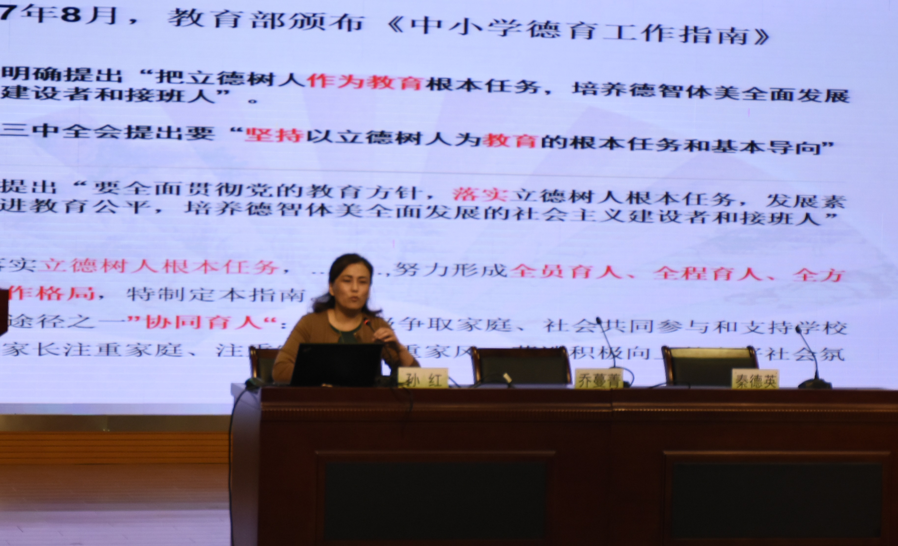 上海市学生德育发展中心副主任孙红做了《坚持立德树人,深化家校协同育人》的主题报告,重点解读了教育部于2017年8月颁布的《中小学德育工作指南》、国家和上海市对于家庭教育工作的顶层设计等内容。同时结合上海市家庭教育示范校的评估工作,进一步就评估定位、评估程序和评估指标等内容作了解读和要求。