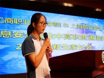 上海商业会计学校副校长王洁首先发表致辞,向与会各位老师,学生家长和学生介绍上海商业会计学校办学情况并分享了学校的校园文化,同时祝愿各位学生能在接下来的五年学习时光中努力求实,为自己的青春写下灿烂的一笔。