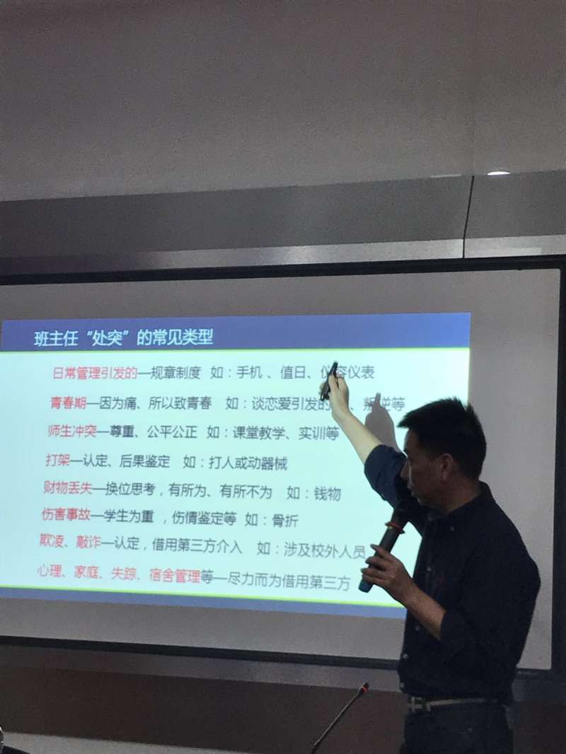 为了提升班主任处理突发事件的能力,实现预防与治理并举的效果,2017年5月23日14点30,在我校一号楼东401举行主题为“应对突发事件,预防治理并举”的专题班主任培训,各教学部学工主任,班主任和辅导员,学生处工作人员近50人参加了培训。本次培训由杨春平主持。