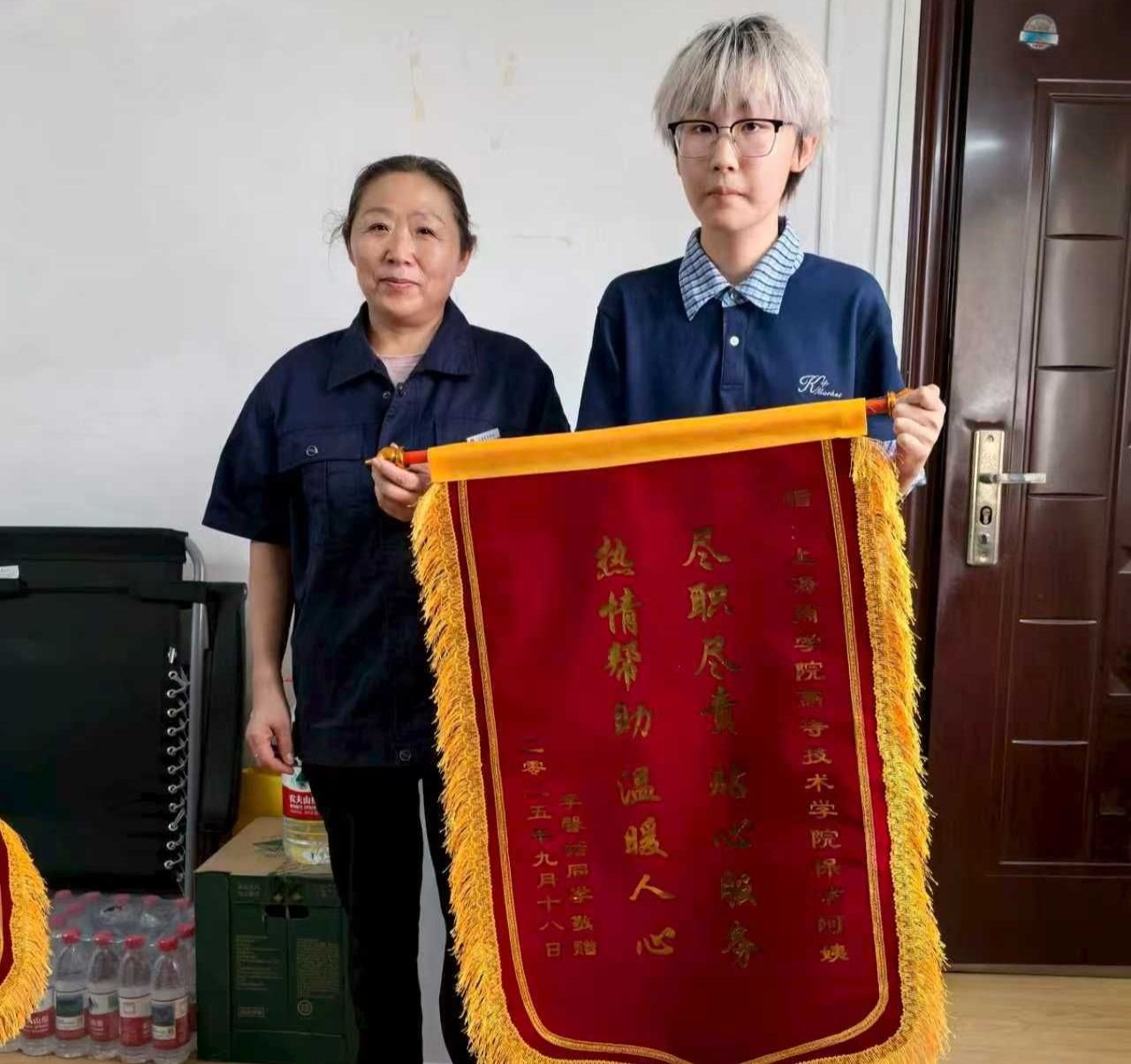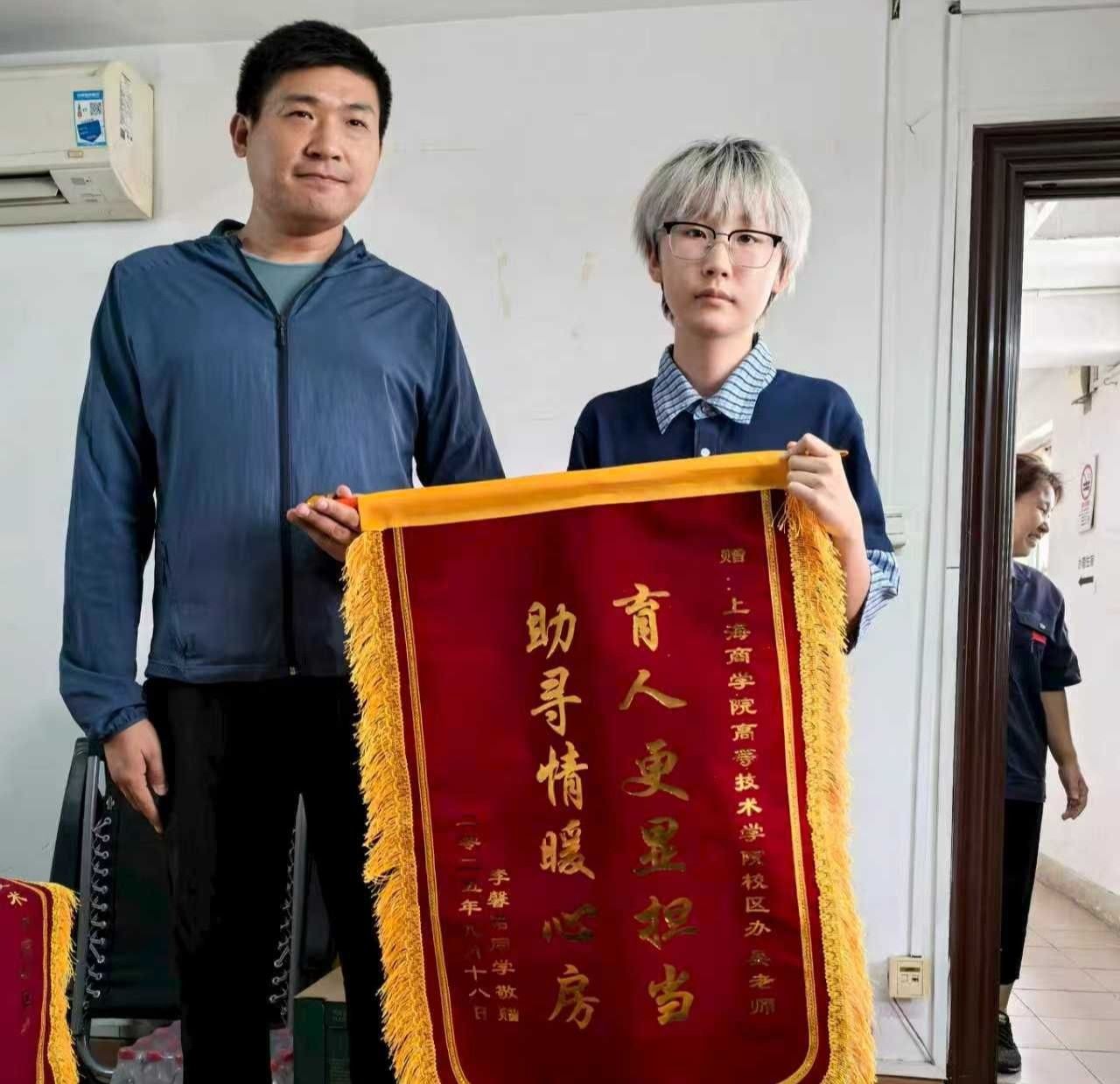 2025年9月18日下午,上海商学院高等技术学院交通路院区出现了感人一幕:关务与外贸服务251班学生李馨诺携两面锦旗——“尽职尽责贴心服务,热情帮助温暖人心”与“助寻情暖心房,育人更显担当”,郑重赠予交通路院区吴承超老师及保洁人员,以表达对院区办保卫教师与保洁人员热情相助的诚挚谢意。图1图2
