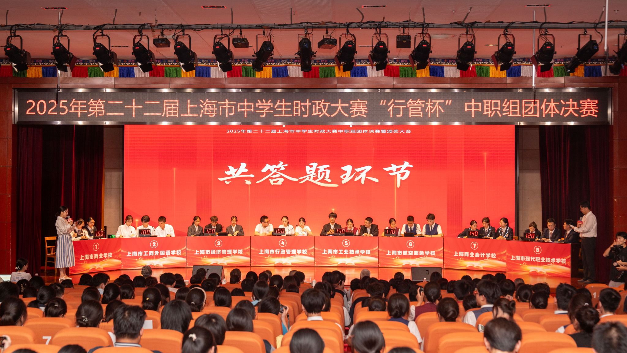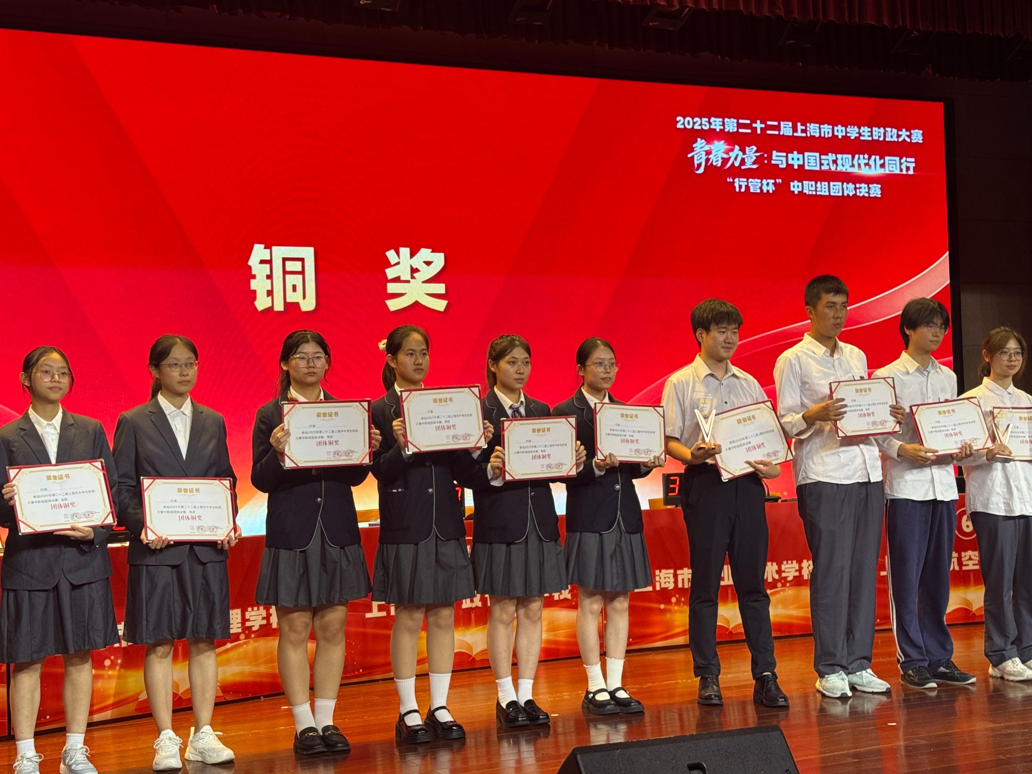 9月25日,第二十二届上海市中学生时政大赛中职组团体赛在上海市行政管理学校圆满落幕。我校学子与其余七所中职院校的参赛队伍同台竞技、各展所长,最终不负“清荷”使命与期望,凭借扎实的时政积累和稳健的现场表现,斩获团体铜奖。
