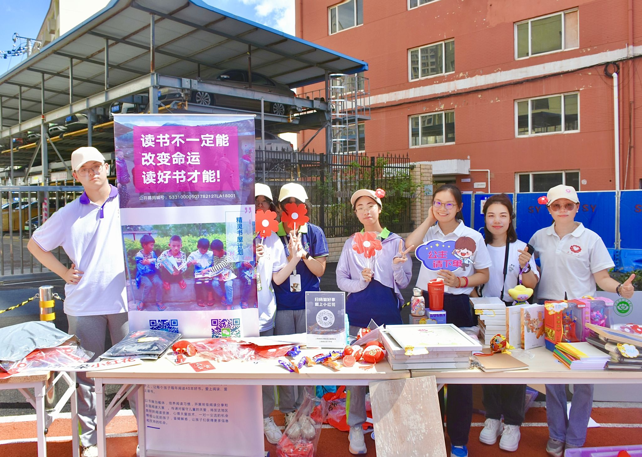 在基金会带来的公益项目展示摊位上,赫然有一个巨大的标题——“读书不一定能改变命运,读好书才能!”。这个标题格外醒目,吸引了众多同学驻足。摊位详细介绍了“精灵书屋计划”的具体内容,包括已受捐助学校的改善情况、孩子们收到图书后的反馈等,让同学们更直观地感受到公益的力量。工作人员还为积极参与互动的同学准备了许多小礼物,这些象征爱心与奉献的小物件,迅速在人群中传递开来,整个公益项目展示摊位前人头攒动,气氛热烈而温馨,成为活动现场一道亮丽的风景线。