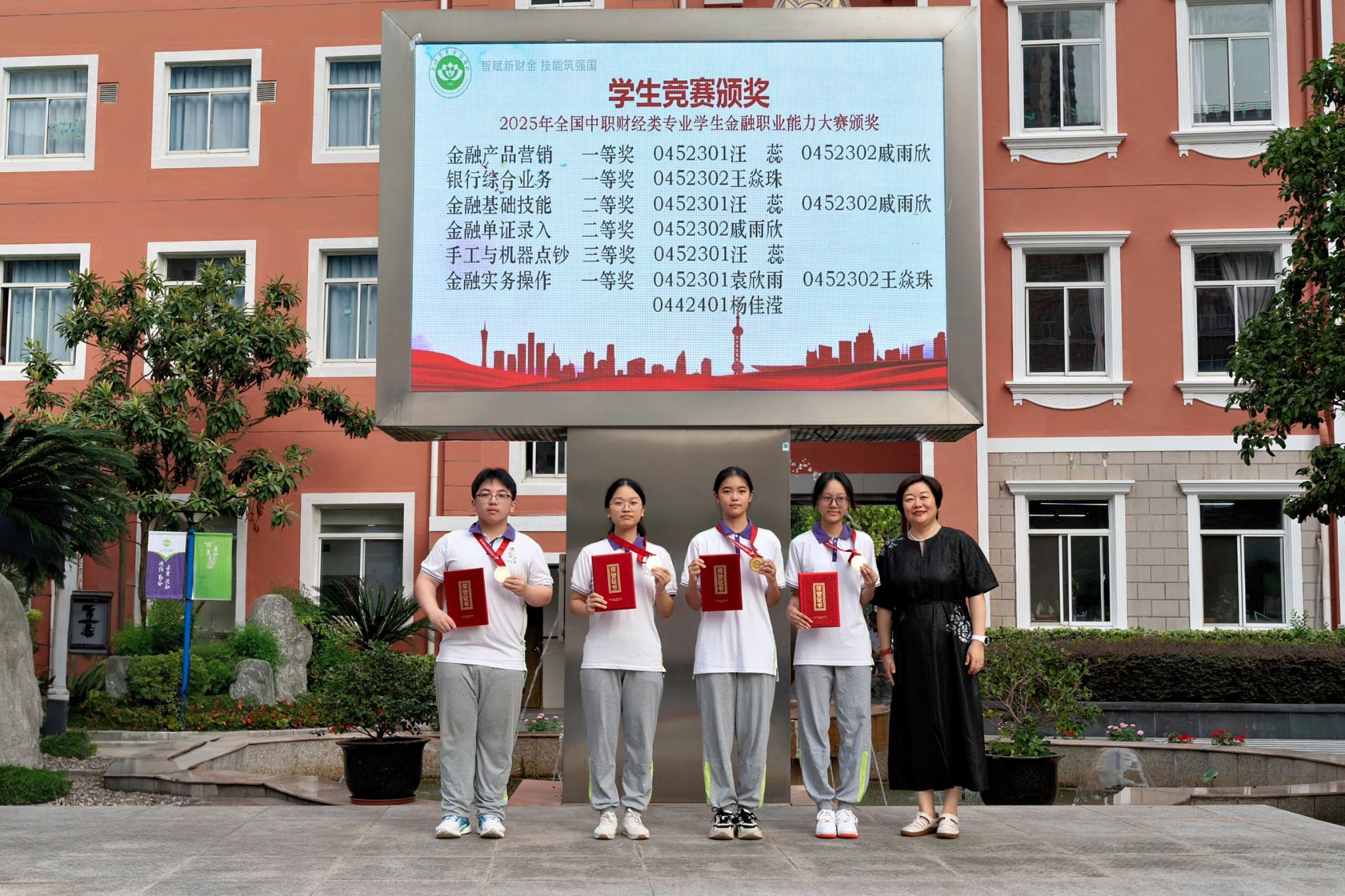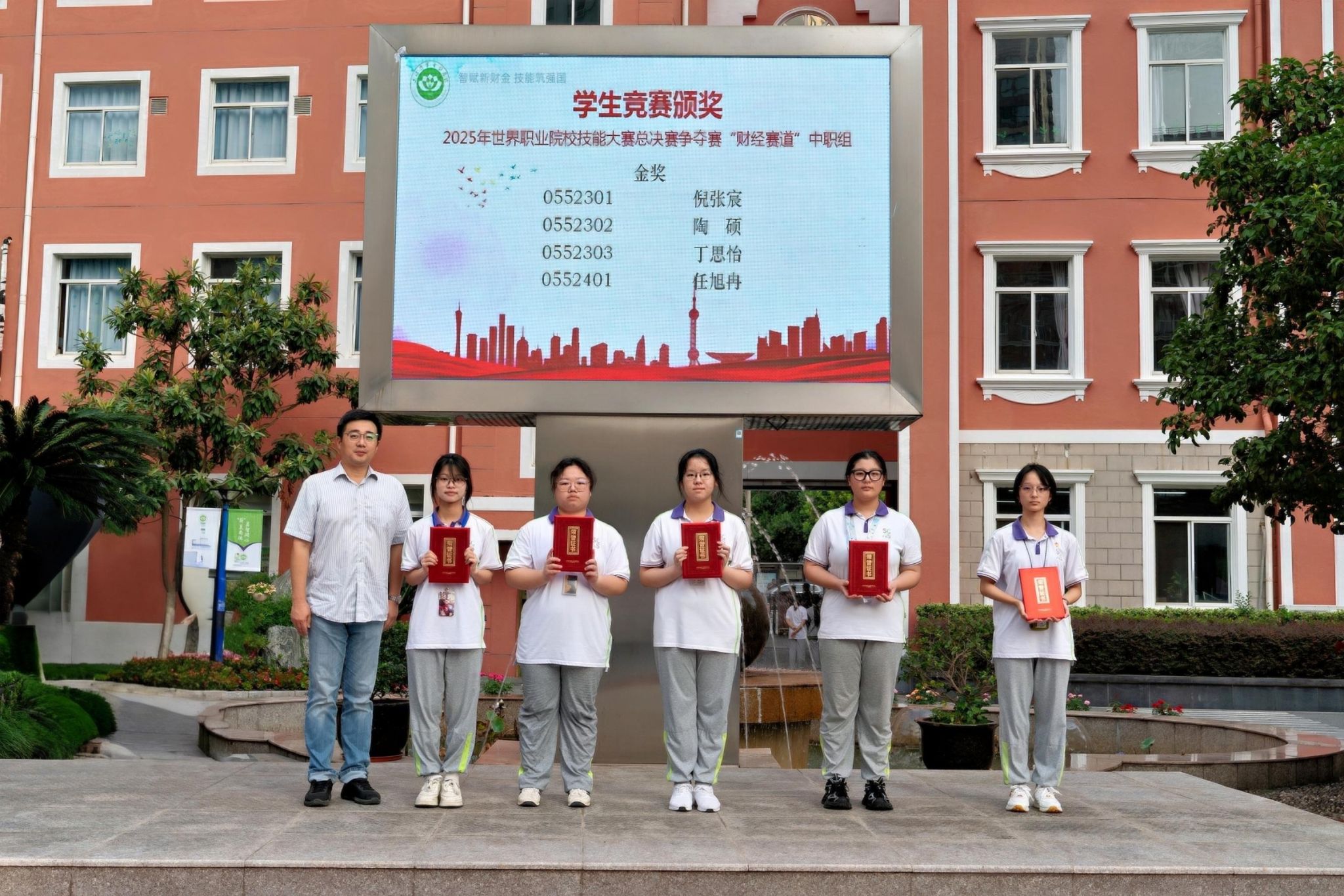 为表彰先进、激励更多学子奋进,仪式现场还举行了颁奖环节。在2025 年世界职业院校技能大赛“财经赛道”、2025 年全国中职财经类专业学生金融职业能力大赛、上海市“星光计划”第十一届职业院校技能大赛企业经营沙盘模拟比赛与智能财税基本技能比赛等赛事中获奖的学生代表依次上台。校长杨菁、党委书记陈震、副校长龚丽分别为他们颁发荣誉证书及奖牌,台下掌声雷动,这既是对获奖学子的祝贺,也是对全体财金学子 “技能成才” 的殷切期许。
