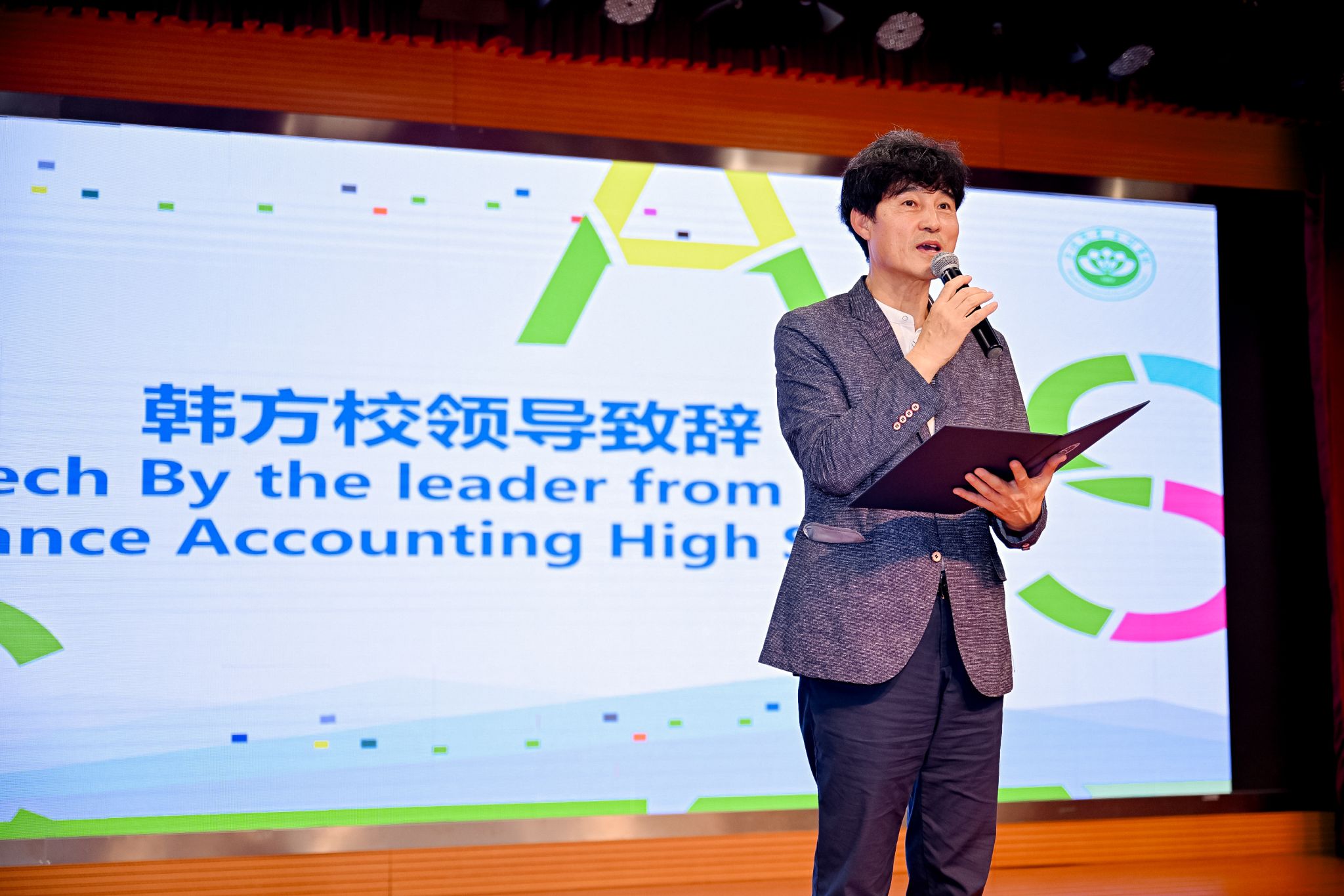 我校为韩国师生举行了一场别开生面的欢迎仪式。仪式上,校长杨菁发表讲话,对韩国师生的到来表示热烈欢迎,并回顾了两校自建立友谊以来在互学互鉴中结下的深厚情谊与共同留下的美好记忆。同时,杨校长对两校未来的合作提出几点展望,希望双方在专业建设、人才培养等方面进一步拓展交流,在校园文化领域开展更深层次的互动与探索,让文化互鉴之花持续绽放,共同推进两校教育事业迈向新的台阶。随后,韩国原州金融会计高中校长许阳旭应邀致辞。他首先对我校的热情接待与长期以来的真诚合作表达了诚挚的谢意。他简要介绍了学校的办学轮廓与教育追求,学校坚守教育质量,洞察市场需求,全力支持每一位学生的个性化发展。最后,校党委书记陈震和韩方校长许阳旭互相赠送纪念品。
