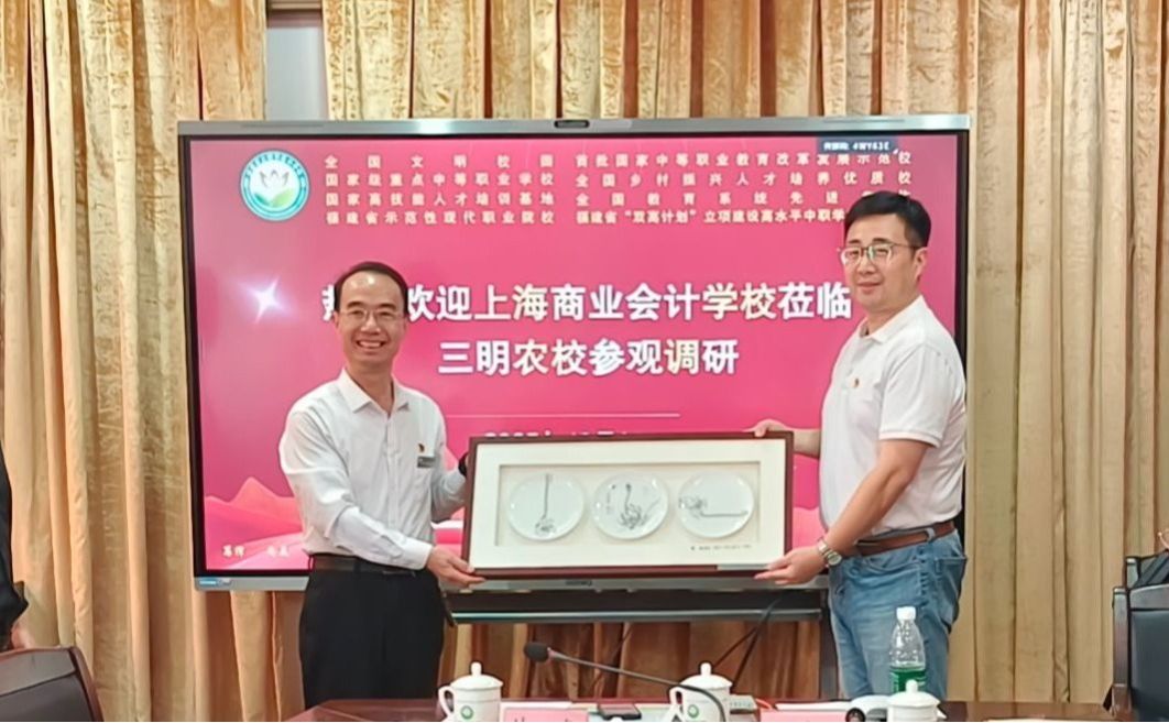 此次调研正值三明市农业学校建校60周年之际,会上,党委书记陈震代表学校向三明市农校赠送了由学校师生制作的非遗瓷刻作品。