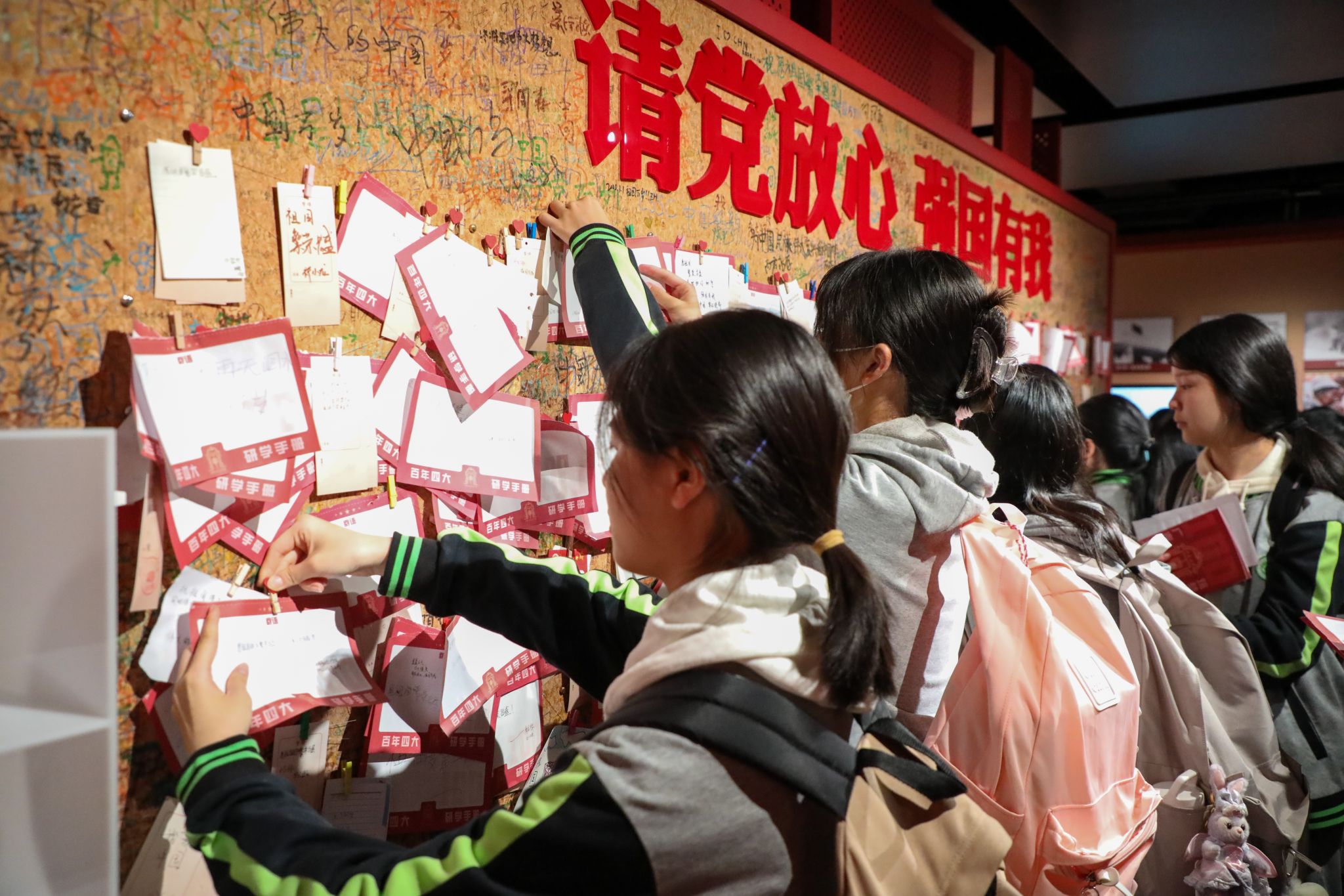 在“国旗飘扬的地方 - 与时代同频共振”展厅, 同学们了解了“一带一路”国际合作背景,直观感受到中国与世界共享发展的宏伟实践,从革命先辈的筚路蓝缕到新时代的开放格局,历史的接力棒已传递到青年手中。随后,“时代楷模”板块深深触动了同学们。这一板块展陈的是在社会主义建设过程中涌现的模范人物事迹。张益涵同学为大家讲解了屠呦呦等优秀共产党员的感人事迹,他们是在国旗下奋斗的杰出代表,他们的精神是爱国主义最生动的诠释。活动尾声,同学们在“请党放心,强国有我”主题留言墙上郑重留言,写下青春誓言:“请党放心 强国有我”“以我辈之奋斗,护国旗之鲜红!”