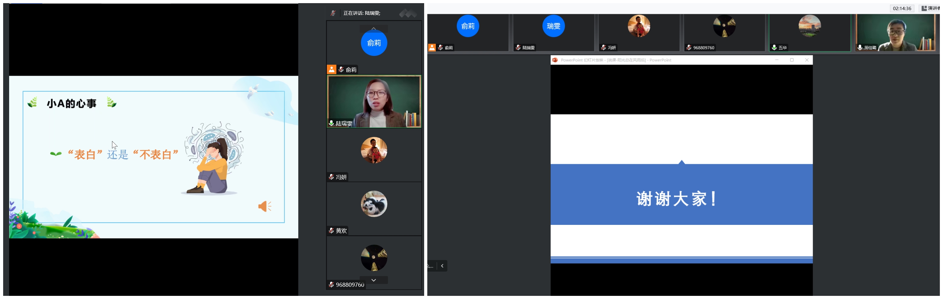 首先,陆瑞雯老师带来了《青春的距离》教学片断展示和说课,课前陆老师通过问卷了解学生青春期的困惑,针对学生存在的问题,通过情景再现,引导学生的思考、讨论,面对喜欢的异性,在青春期的年龄是否适合表白,青春期的恋情可能会带来的后果,进而掌握异性同学交往的注意事项。之后,周佳璐老师带来的是《阳光总在风雨后》的教学片断展示和说课,通过案例展示学生在实习中遇到的困难,请班级同学围绕困难群策群力克服挫折,再回到现实生活中,用本节课学习到的方法解决自己曾遇到的困难。两位老师通过精彩的教学展示,将中职思政课核心素养融入课堂教学过程中。