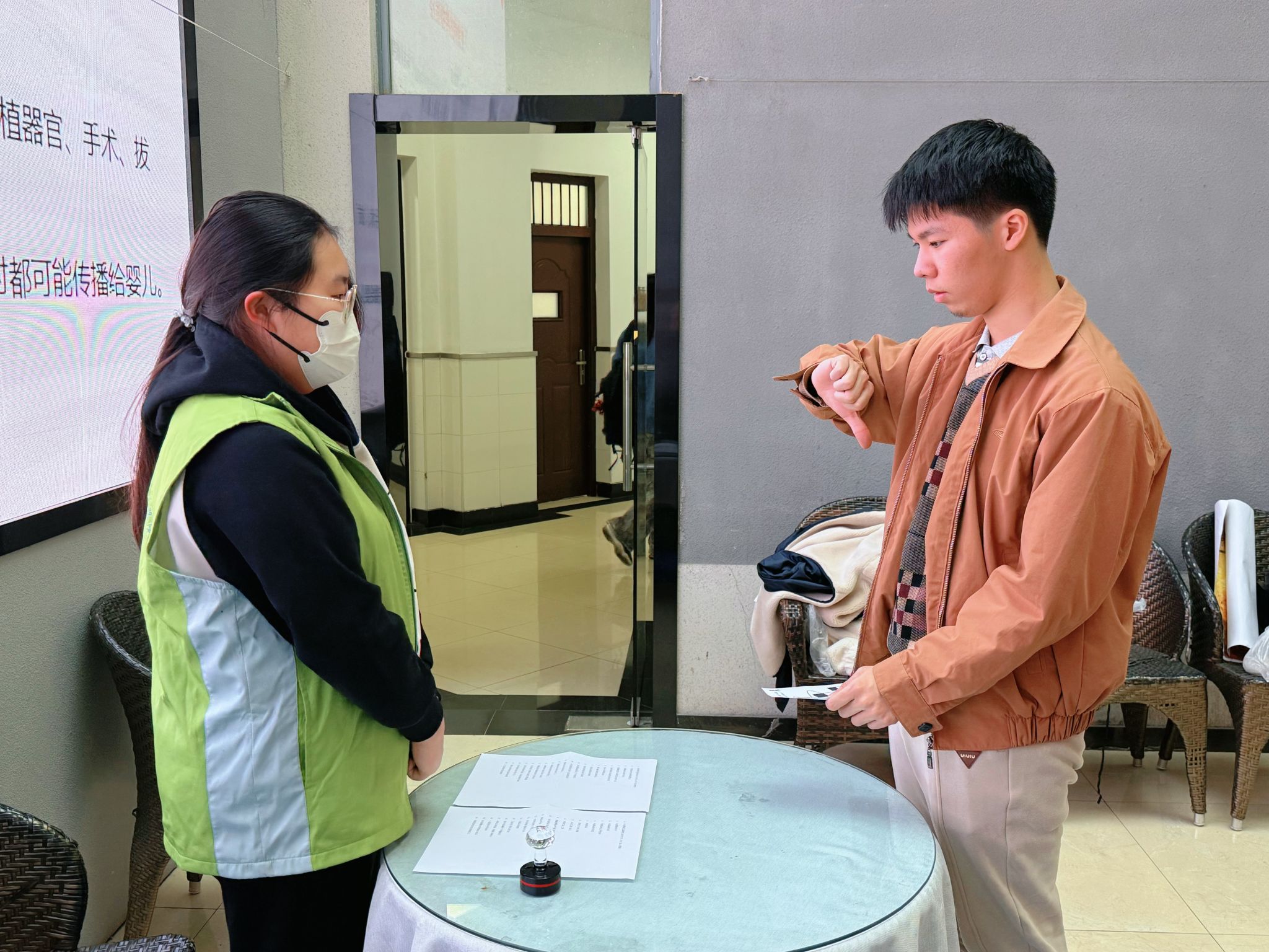 第二项核心内容“手势互动游戏”以其动态、高效的互动模式,实现“在游戏中学习,在互动中辨析”的活动目标。参与者需根据工作人员喊出的行为关键词(如“共用牙刷”、“拥抱”等),快速通过“竖大拇指”(安全)、“倒大拇指”(高危)两种手势进行判断。判断错误的参与者通过大声跟读一条核心知识的方式进行温和纠正与强化记忆,有效激发师生们的挑战欲和求知欲。