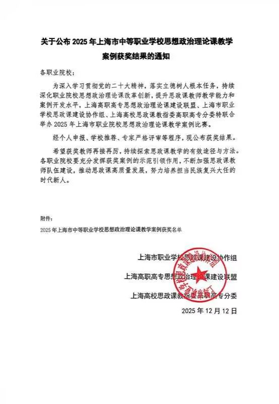 近日,2025年上海市中等职业学校思想政治理论课教学案例比赛获奖名单正式公布,我校选送的多篇教学案例凭借扎实的内容、创新的设计和显著的育人实效,在众多优秀作品中脱颖而出,荣获一等奖、二等奖、三等奖各一项,充分展现了我校在思想政治理论课教学改革与实践探索中的深厚底蕴与丰硕成果。