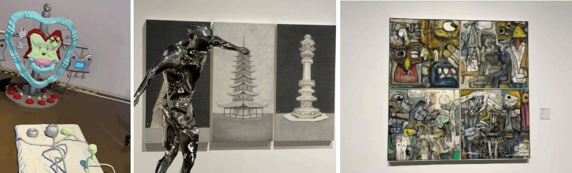 季瑞卿同学:“踏入中华艺术宫,当代艺术的多元表达撞入视野,几件作品尤其让我驻足思索。充满先锋感的装置艺术十分吸睛,心形框架包裹着色彩怪诞的抽象造型,金属、塑胶的材质碰撞,搭配科技感的电子屏幕,仿佛将“情感”拆解为机械与具象的结合体,用戏谑又尖锐的方式探讨现代社会中情感的异化与物化。而那尊镜面金属的人体雕塑更具张力,流畅扭曲的线条打破了传统人体雕塑的写实桎梏,镜面反射中与背景的古典建筑图景交融,古今对话的张力在金属的冷冽光泽里悄然迸发,仿佛是当代人对传统美学的回望与重构。还有那幅抽象四联画,斑驳的色彩与交错的线条交织成混沌又鲜活的视觉迷宫,没有明确的物象,却能从笔触的轻重、色彩的铺陈中感受到艺术家情绪的流动。看似无序的画面里,藏着对生命、对世界的主观解构,让我体会到抽象艺术“以意造形”的独特魅力。这些作品跳出了传统艺术的审美框架,用多元的媒介与表现形式,让我看到艺术不再是单一的摹写,而是对时代、人性、传统的深度叩问。中华艺术宫不仅是艺术的容器,更成为连接古今、沟通中外艺术语言的桥梁,让我对当代艺术的表达有了更鲜活的理解。“