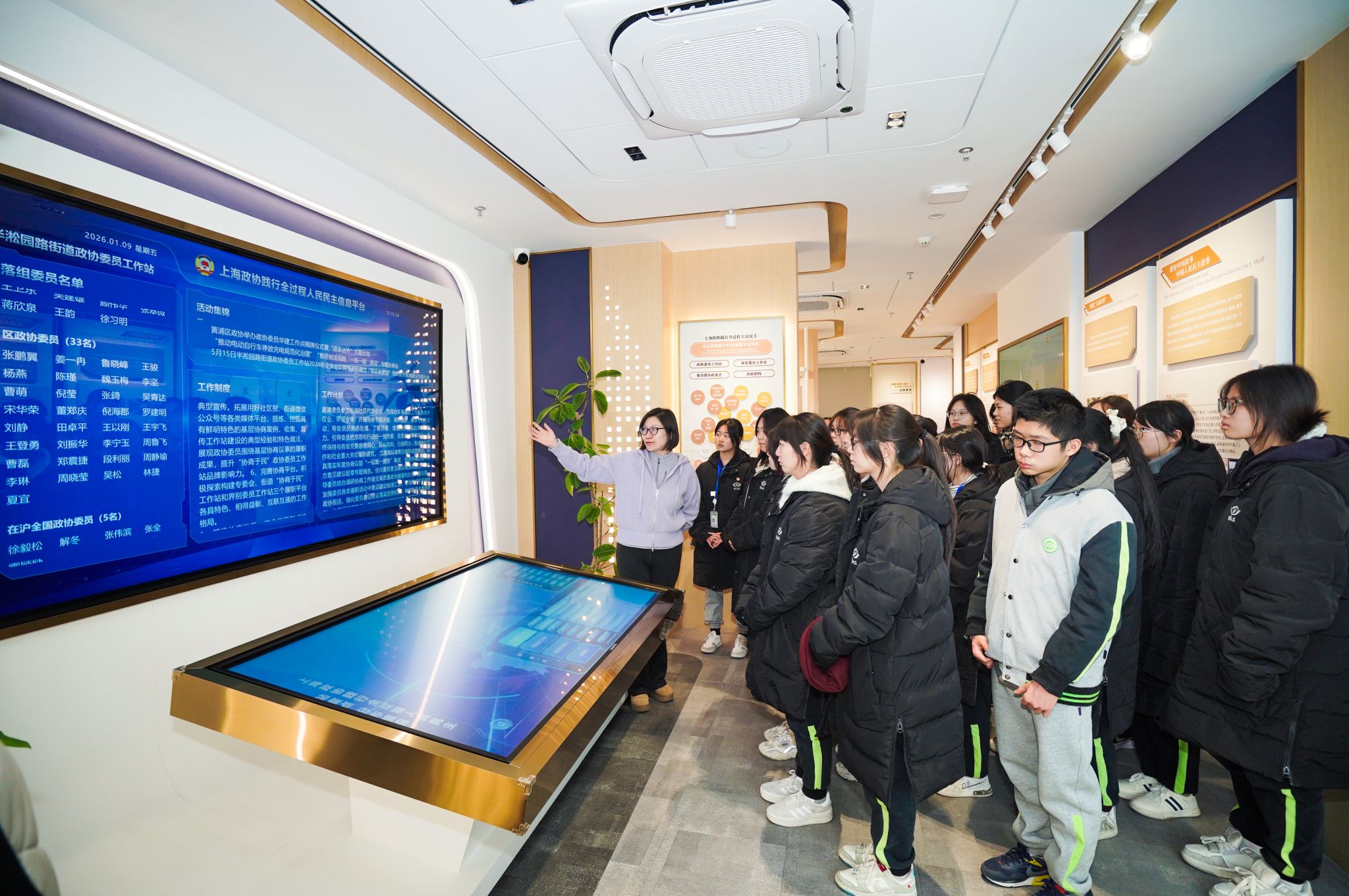 在参观学习中,同学们追溯中国协商民主的发展脉络;了解不同界别代表如何围绕各项议题协商讨论;在互动屏前触摸点击,跟踪各区各街道实践点如何将一份份建议从收集、调研、提交到落实的完整闭环,重点查看了学校两个校区所在地街道——“半淞园路街道”与“宜川路街道”的相关案例。场馆中的每一个场景,都成为思政教材的立体延伸;每一次互动,都在深化学生对“全过程人民民主”的理解。行走的思政课让抽象的理论化为可感的体验,让制度的优势变成看得见的实践。
