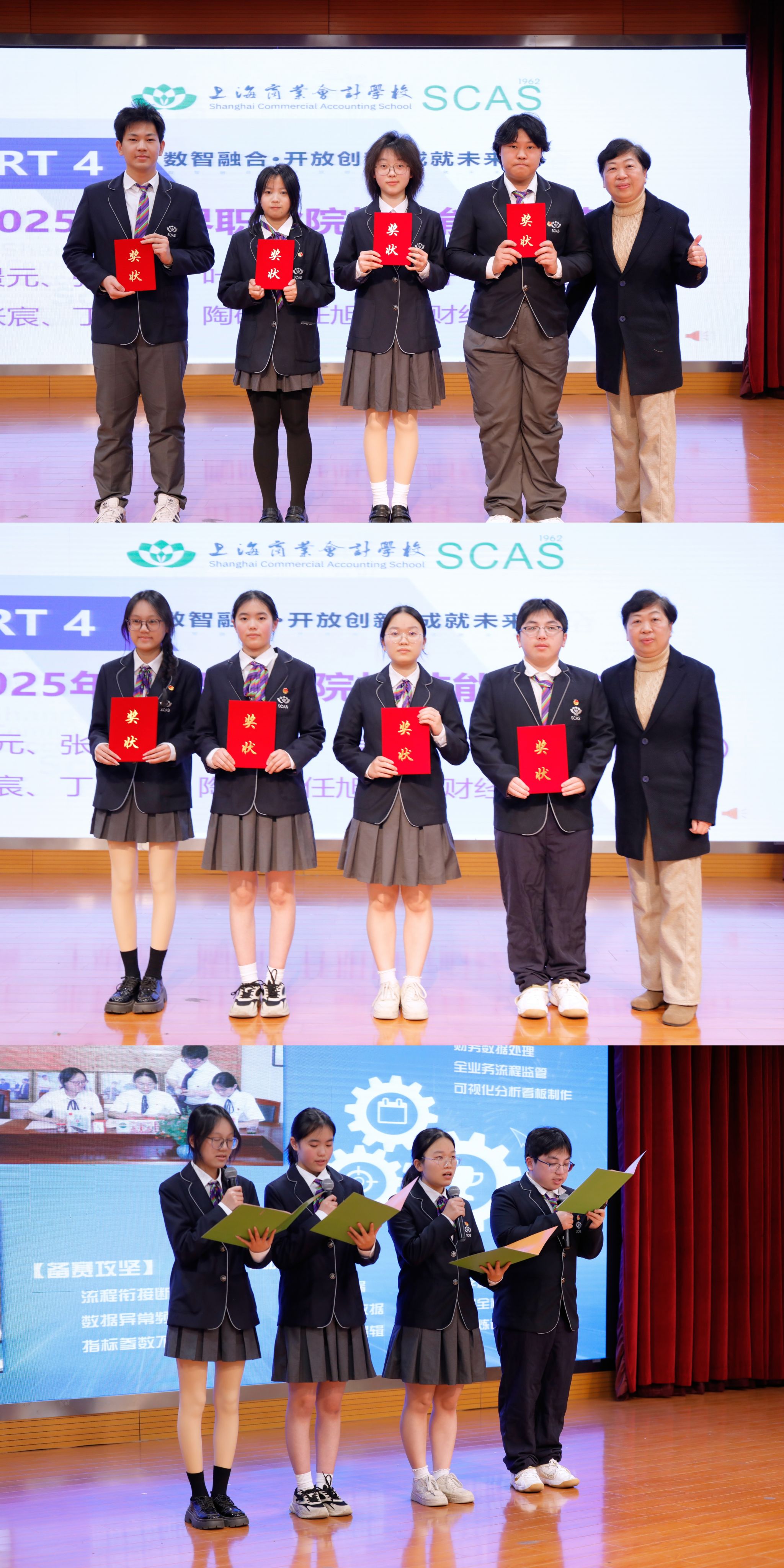 第四板块“技能荣耀・大赛点亮未来”为会议画上圆满句点。会议对2025年世界职业院校技能大赛获奖者进行表彰,刘景元、张銤琦、叶淑婷、端木友圩四位同学凭借过硬实力斩获人工智能赛项铜奖,倪张宸、丁思怡、陶硕、任旭冉四位同学在财经赛道(中职组)中勇夺金奖,校党委委员、党办主任林蔚老师为获奖学子颁奖。