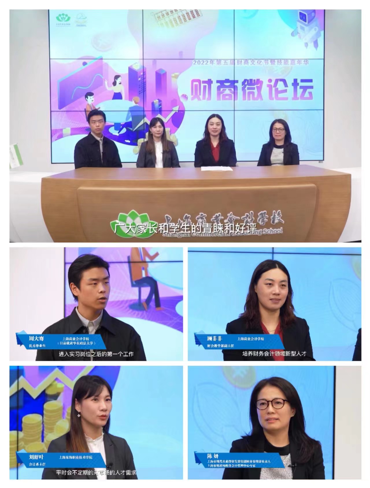 随着经济社会发展,行业、企业对财经商贸类人才的需求发生转变。在财商微论坛的现场,我校财会教学部副主任顾非非对优秀毕业生周大骞、高校会计系主任刘舒叶以及企业专家陈妍等三位嘉宾进行访谈,进一步了解企业用人标准、高校育人目标,同时聆听学长成长感悟,以不同视角帮助我校学生对未来职业发展的目标有更清晰地认识和规划。