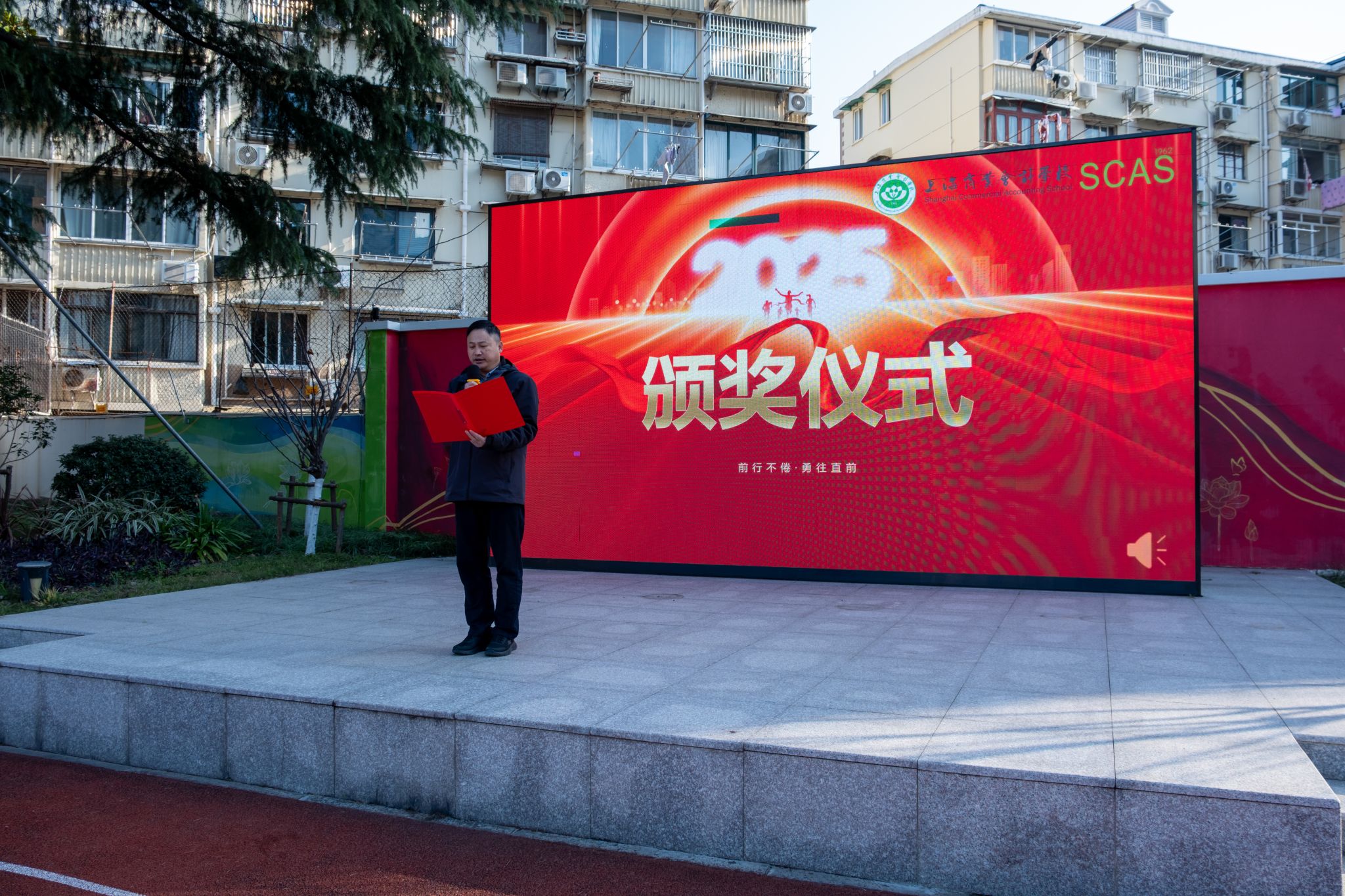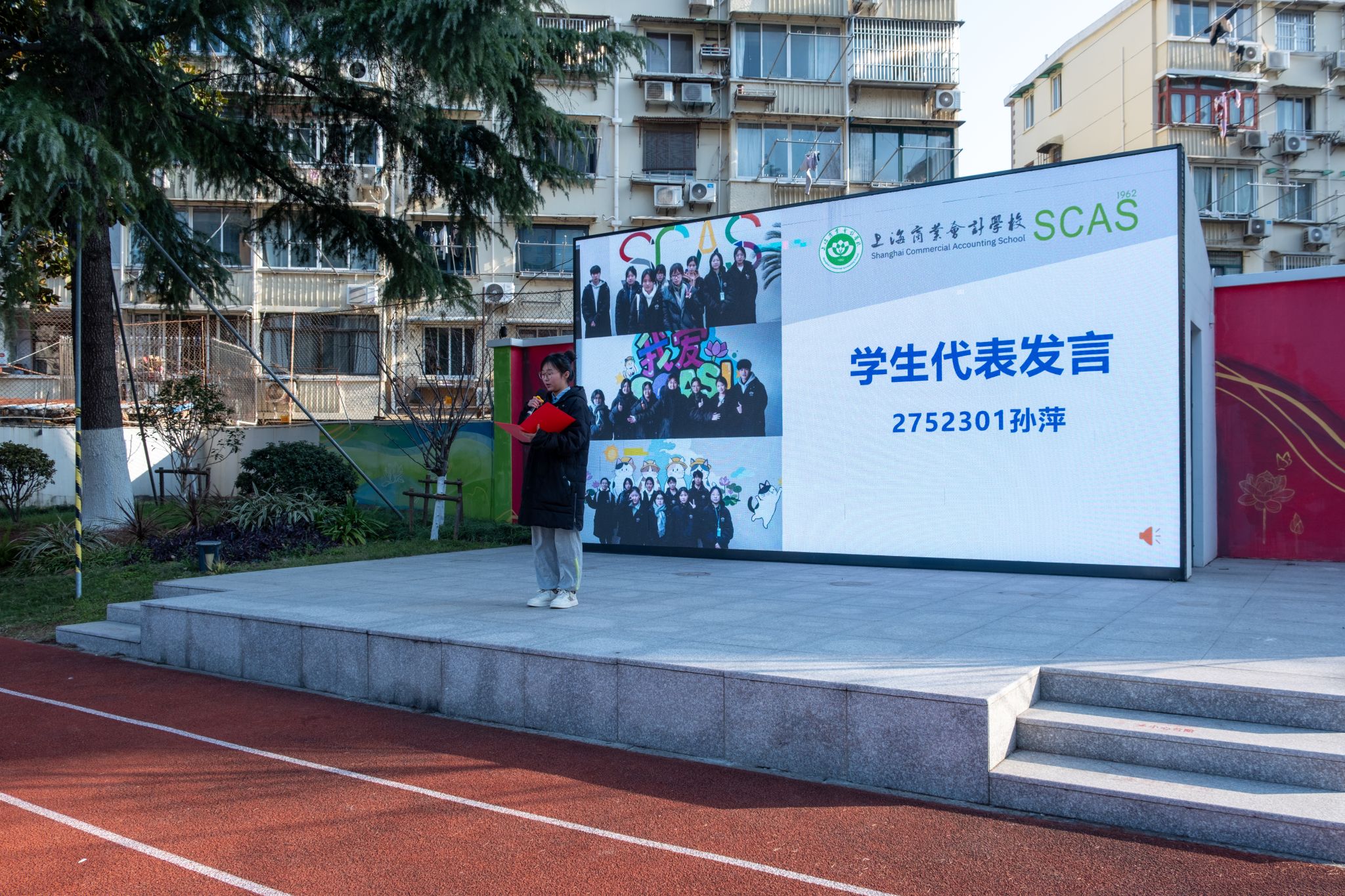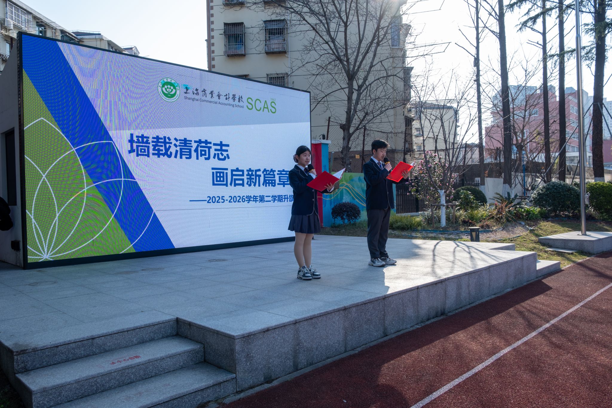 2026年3月11日,春风和煦,朝阳初升。上海商业会计学校普陀校区全体师生齐聚操场,举行以“墙载清荷志,画启新篇章”为主题的2025-2026学年第二学期升旗仪式。本次仪式紧扣时代脉搏,将国家发展蓝图、世界技能盛事与学校创新定位深度融合,为新学期拉开了充满希望与奋斗的序幕。校领导班子出席升旗仪式。24级会计事务专业劳世宸同学和中高贯通关务与外贸服务专业陈菲圆同学共同主持本次升旗仪式。
