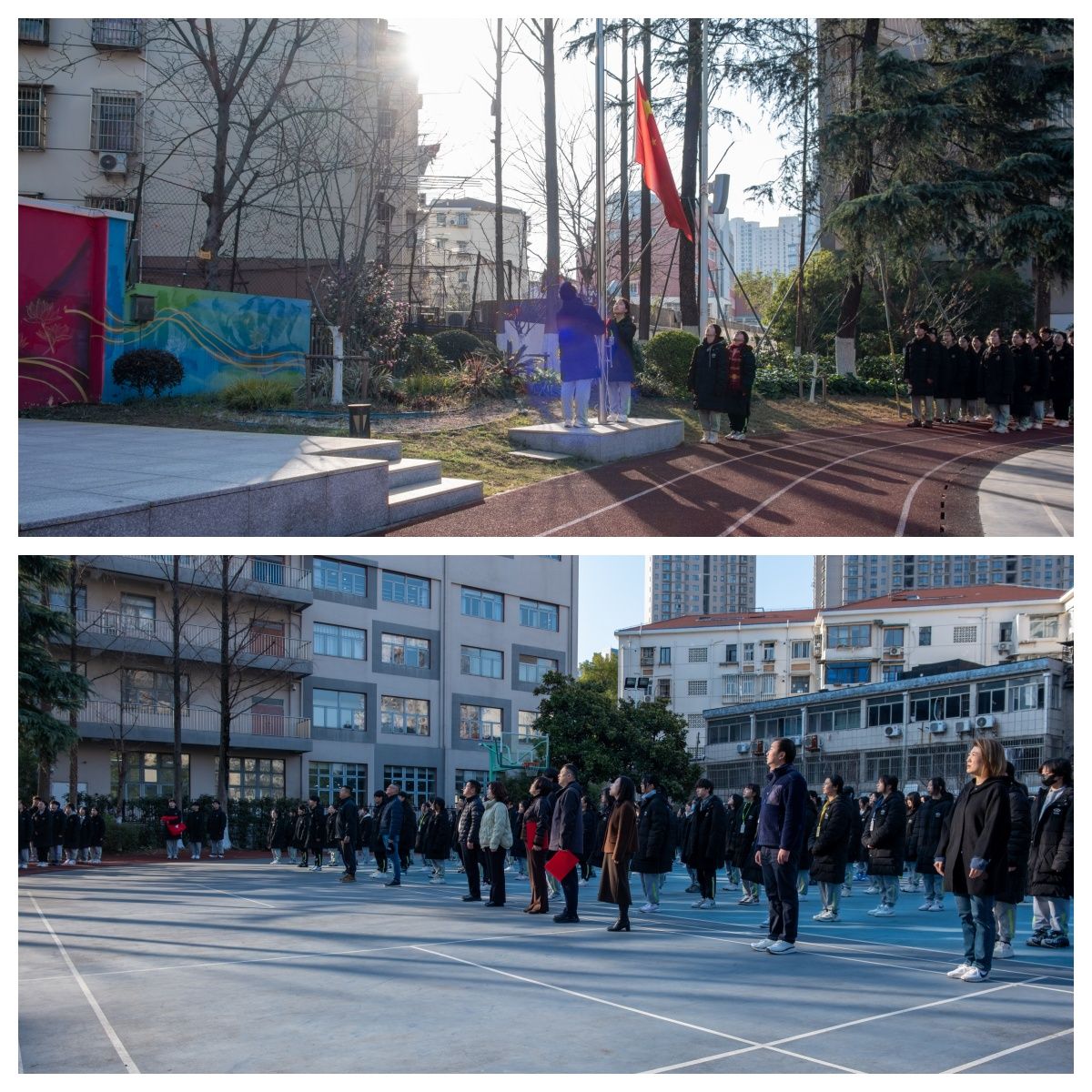 在雄壮的国歌声中,鲜艳的国旗冉冉升起,全体师生肃立行注目礼,心中激荡着对祖国的热爱与对新学期的憧憬。