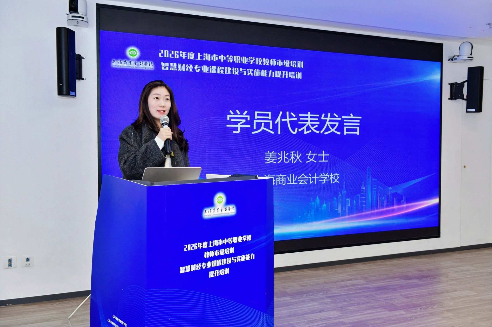 来自上海商业会计学校的学员代表姜兆秋老师在发言中表达了对本次培训的期待与感谢。她表示,作为一线教师,面对智慧财经背景下的课程改革与教学创新,深感责任重大,必将珍惜培训机会,认真学习、积极交流、学以致用,努力提升自身专业素养和教学实施能力。