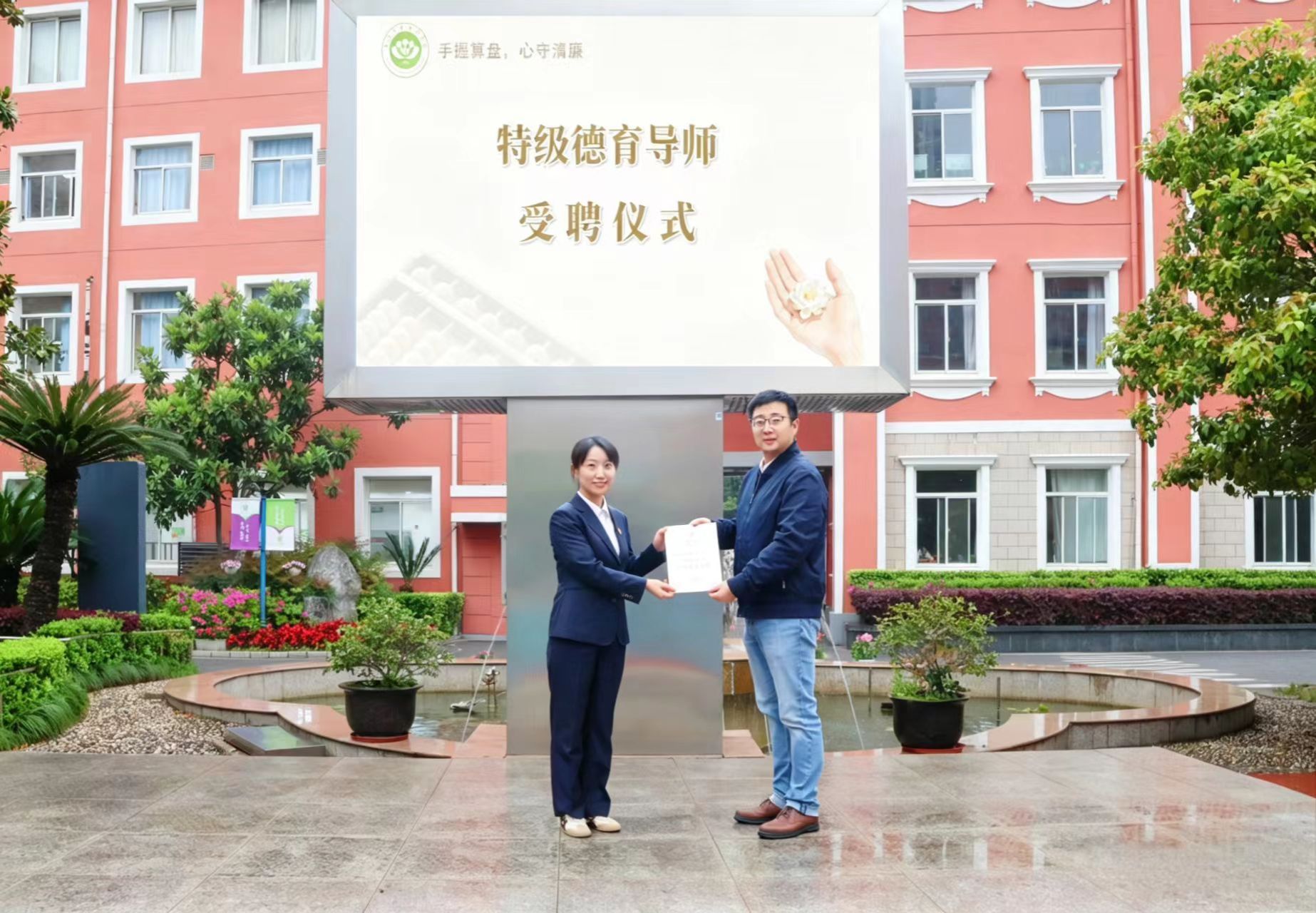 劳动铸就梦想,廉洁彰显担当。仪式现场举行特级德育导师受聘仪式,我校特聘全国“五一劳动奖章”获得者、中国银行上海分行卢湾支行的张磊女士为特级德育导师,党委书记陈震老师为其颁发聘书。