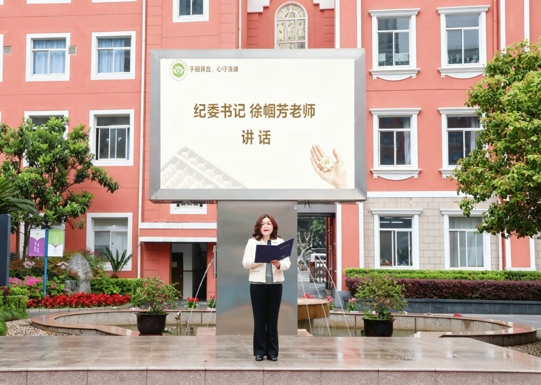 最后,纪委书记徐帼芳老师作国旗下讲话。她向全体财金学子提出三点殷切期望:坚定理想信念,筑牢廉洁从业思想根基;精进专业技能,在技术迭代中坚守廉洁防线;践行清廉使命,以青春担当传承清荷品格。勉励大家以清荷为镜、以廉洁为尺,勤学笃行、德技并修,成长为守初心、明底线的高素质财金技能人才。