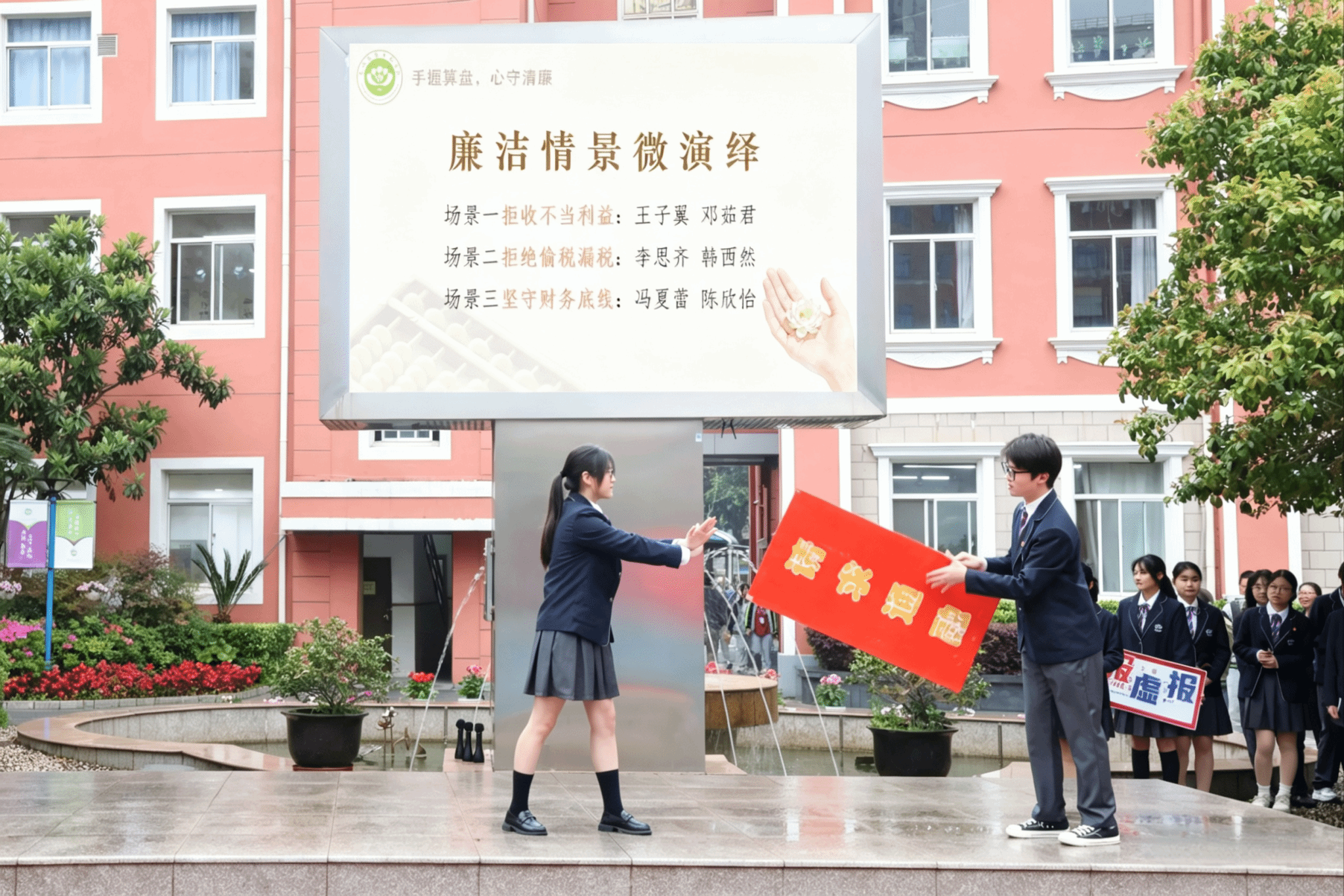 礼毕,一场生动的廉洁情景微演绎正式上演。同学们立足财金专业特色,以校园与职业场景为蓝本,演绎面对诱惑坚守底线、恪守原则的鲜活故事,三场演绎,三种坚守,直观展现 “清廉做人、规矩做事” 的深刻内涵,让廉洁理念直抵人心。