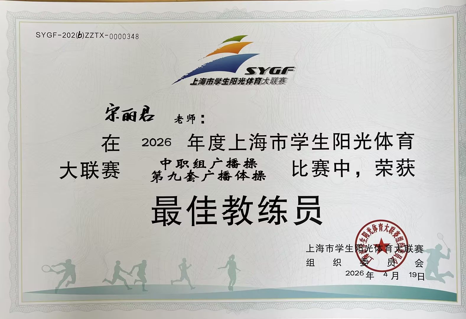 我校学生广播操队凭借整齐规范的动作、昂扬饱满的精气神、团结奋进的团队风貌,在众多参赛队伍中脱颖而出,成功斩获一等奖(第三名),宋丽君老师凭借专业扎实的指导,荣获赛事“最佳教练员”称号,以优异成绩为学校争光,充分展现了清荷学子的青春朝气与我校体育教育的扎实成效。