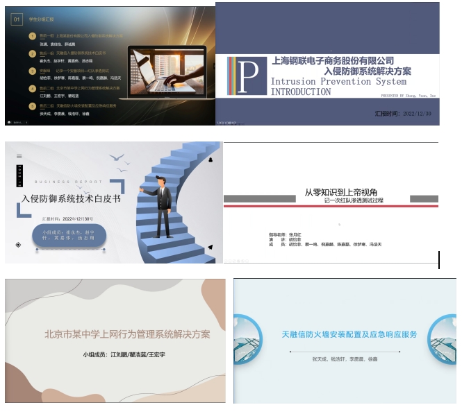 汇报同学分为五组进行汇报,其分别为:售前两组、安服一组、售后两组。五个小组通过5个真实的项目案例展示企业业务的运作。售前组主要陈述了解现实的企业需求后能够利用所学应对现实的需求,完成方案的设计和方案的实施。安服组汇报以渗透测试为主题开展,讲述渗透的流程和对渗透工具的使用,通过自己平时工作中学习的能够不断的去调整渗透的思路来应对不同的环境和场景。售后组主要分为两个汇报主题,分别是上网行为管理和防火墙等传统的安全产品。其产品基本的工作原理都是通过阻断的形式限制访问途径对企业的网络实现基本的保护,结合各种实战的报告形式,让项目实战更专业更全面。