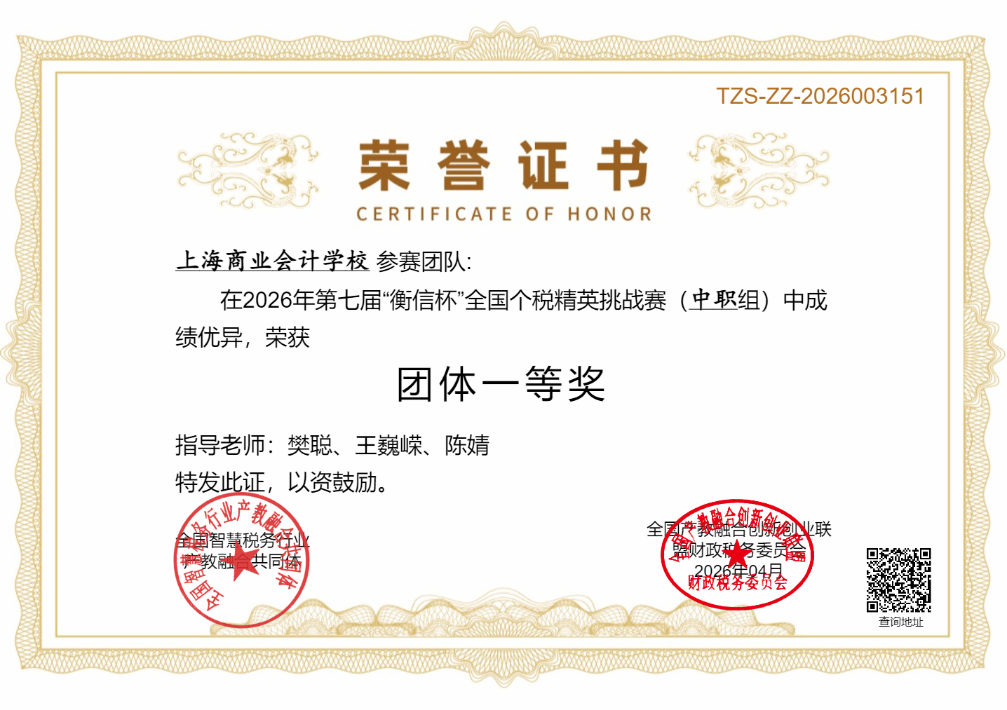 2026年3月30日,第七届“衡信杯”全国个税师精英挑战赛正式拉开帷幕。经过为期两周的激烈角逐,上海商业会计学校代表队以扎实的专业功底和出色的团队协作,从全国69所中职院校中脱颖而出,成功摘得团体第一名,这是我校第四次参加该项赛事,也是成绩最好的一次。再次彰显了我校在财税教育领域的领先实力。