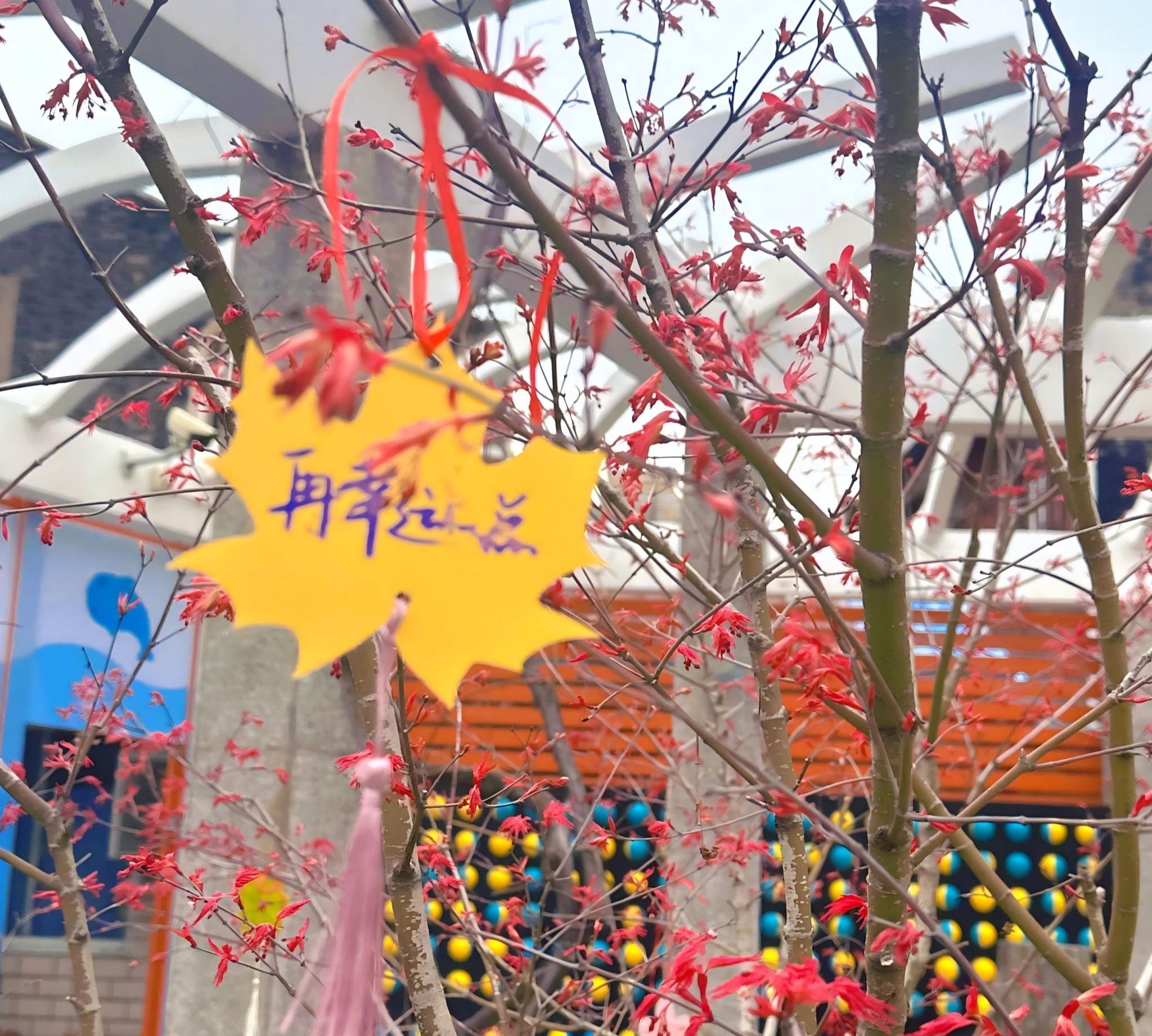 走进商会校的校园东南角,你可能会被一阵色彩“绊”住脚步。这个被命名为“栖心苑”的心灵绿洲,原本是一片静谧的绿地,经过同学们的共创改造,如今已经成为一个可互动、可停留、可疗愈的“心灵生态系统”。石板地面被色彩明快而富有生机的彩绘涂鸦覆盖,草丛间错落分布着仿真松鼠、猫咪、蘑菇地插和木质欢迎牌,营造出沉浸式的自然童趣氛围。红枫树上挂满了各色心愿卡片,承载着学生对未来的期许和对自己的鼓励。花园深处的“翻转心语墙”,以双色球互动装置为核心,引导学生将抽象情绪转化为具象图案、文字或符号,在指尖翻转间完成情绪释放与自我表达。脚边由手绘石堆砌而成的“心愿灯塔”,每一块石子都承载着学生的心声与创意,或书写励志话语,或绘制个性图案,凝聚而成的灯塔则象征着团结与希望,让个体成长不再孤单。