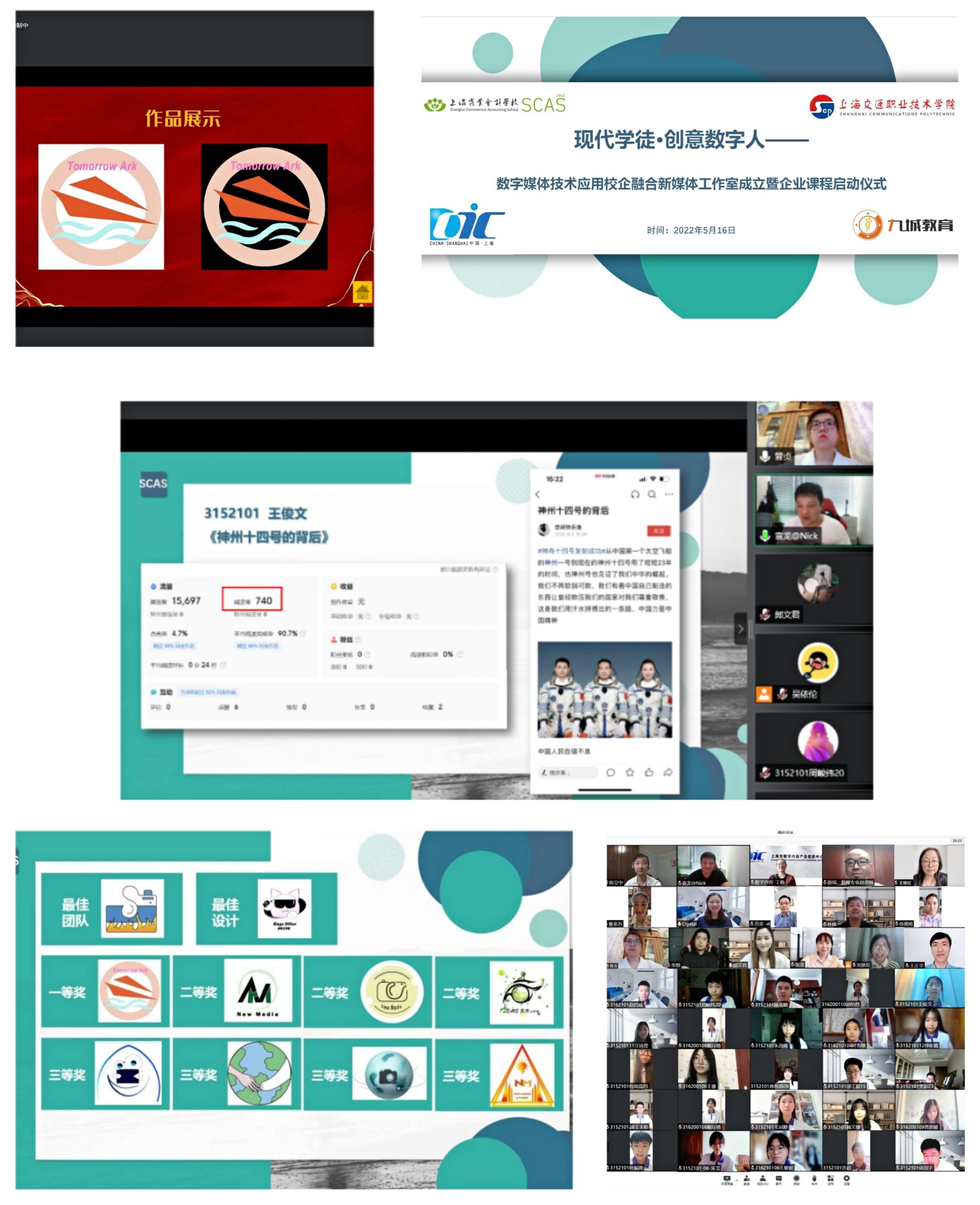 2022年7月5日下午我校信息艺术教学部在腾讯会议线上举办了“创意数字人•新媒体创作”——新媒体工作室LOGO设计比赛颁奖暨自媒体账号运营学习线上汇报。本次参会人员有:上海数字内容产业促进中心副主任丁燕,上海九育教育科技有限公司CTO袁龙,上海市交通职业技术学院人文艺术系主任王晓红、数字媒体艺术设计专业带头人赵震,上海商业会计学校副校长范荣,信息艺术教学部主任周艳萍,普陀校区办副主任陈立中、林樑 ,3152101班主任王正宇,新媒体专业全体教师以及参与活动的同学。