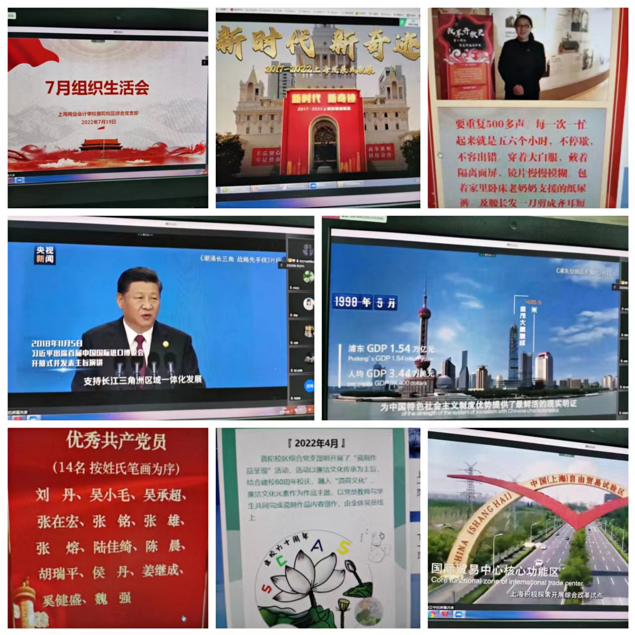 本次会议由支部书记陈立中老师主持,主要有2个议程:一是组织生活会,二是主题党日活动。在第一个环节,陈书记首先就当下疫情防控、学习强国学习、青年思政长效机制课题完成情况和“一支部一实事”2.0升级版的思考进行沟通交流。随后,在书记带领下,大家集中学习了上海市第十二次党代会精神及同心抗疫廉洁育人-------上海商业会计学校清荷党员抗疫廉洁文化教育纪实。尽管早在7月1日,党员老师们已经通过手机和电脑端参加了学校2021-2022学年“七一”评选表彰大会,学习了优秀共产党员的先进事迹,回顾了抗疫廉洁清荷党员风采,并学习了上海市第十二次党代会精神,甚至撰写了心得体会。但通过本次集中学习,再次提升了思想认识和政治觉悟,更加激发了党员老师们向优秀党员学习、致敬,不甘落后,主动投身疫情防控、学校发展和国家社会发展中的热情和干劲。