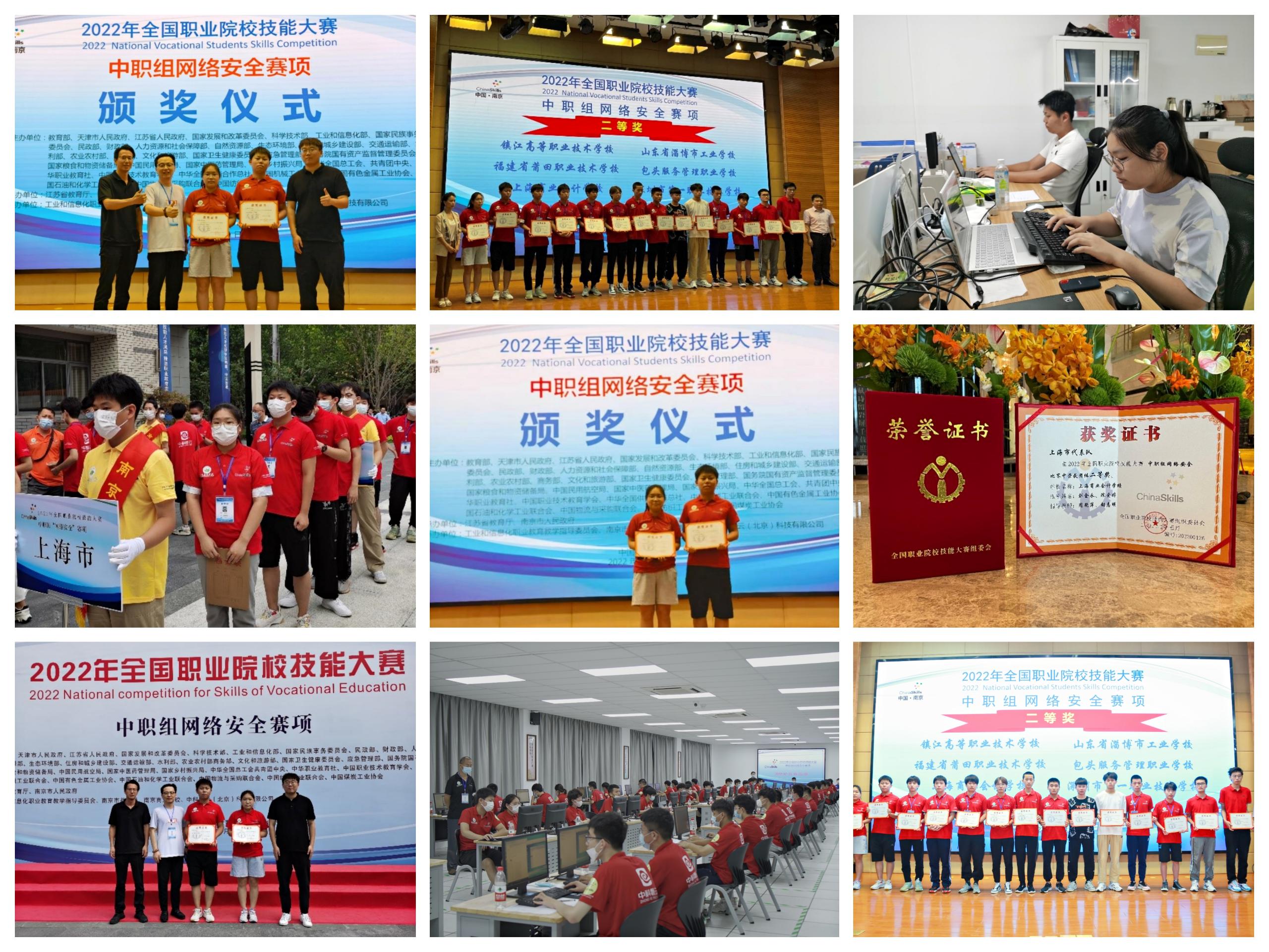 7月30日—31日,为期两天的2022年全国职业院校技能大赛(中职组)“网络安全”赛项在江苏南京商业学校举行,共有来自全国各省、市、自治区的63支代表队一百余名选手参赛。上海商业会计学校中高贯通网络信息安全专业19级刘金永和20级陈爱婷两位选手代表学校参赛,同时陈爱婷同学也是学校历届首位参加此项国赛的女选手。在两天的激烈角逐中,两位选手沉着面对,表现出色,从63支队伍中脱颖而出,最终夺得团体二等奖的好成绩,这也是我校连续第5年在“网络安全”国赛上获奖,为学校网安国赛征程续写新篇章。学校高度重视此次比赛,副校长范荣、信艺教学部主任周艳萍、两位指导教师胡志明、陈冠奇全程陪赛,做好学生比赛期间的保障工作。