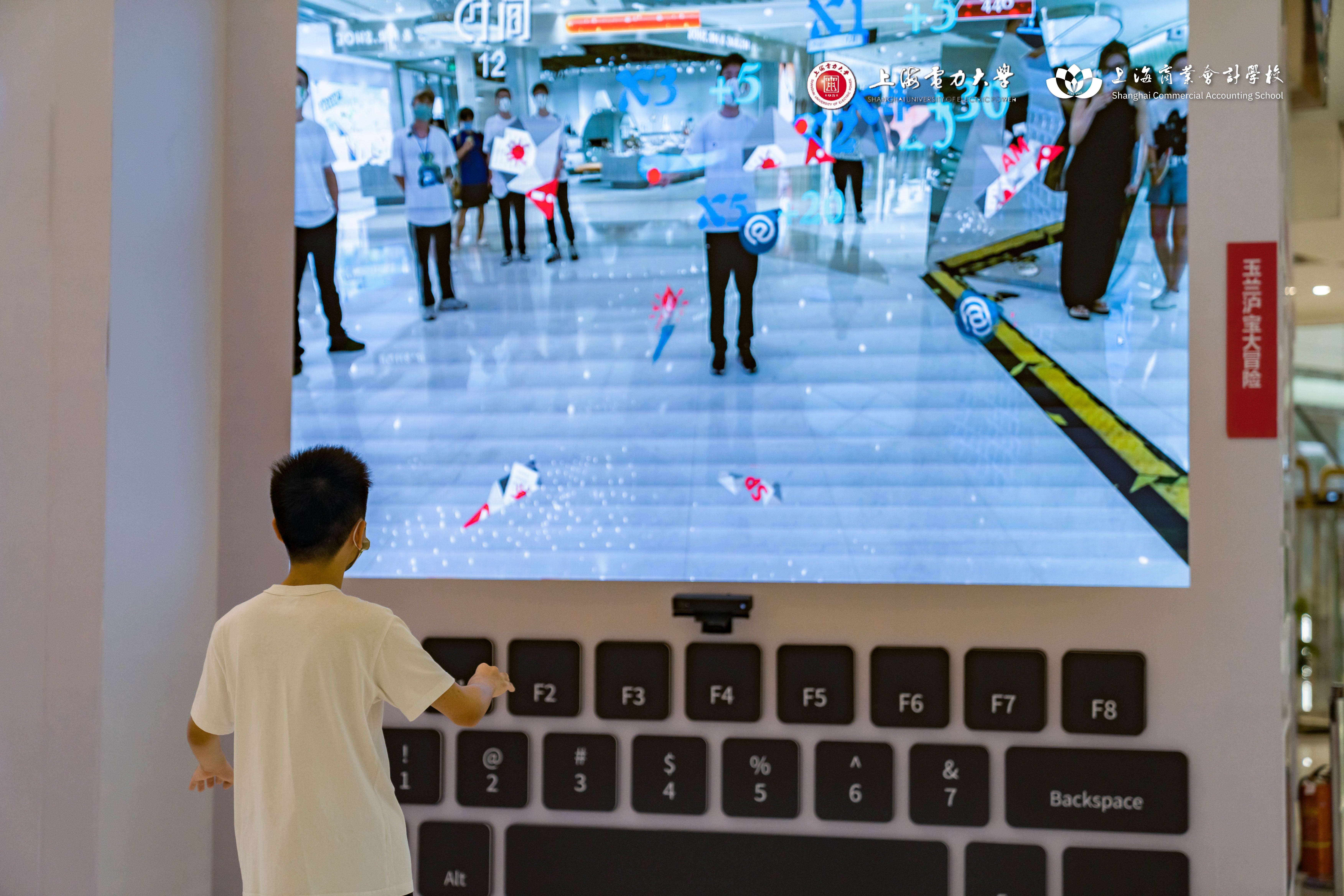 “玉兰沪宝大冒险”环节中,学生站在一张大型LED显示屏前,熟练地玩起了“切切乐”小游戏——通过挥舞双臂,屏幕中出现的各类网络病毒和陷阱被一一切除,保护屏幕中的“玉兰”和“沪宝”两位网络安全IP卡通形象。