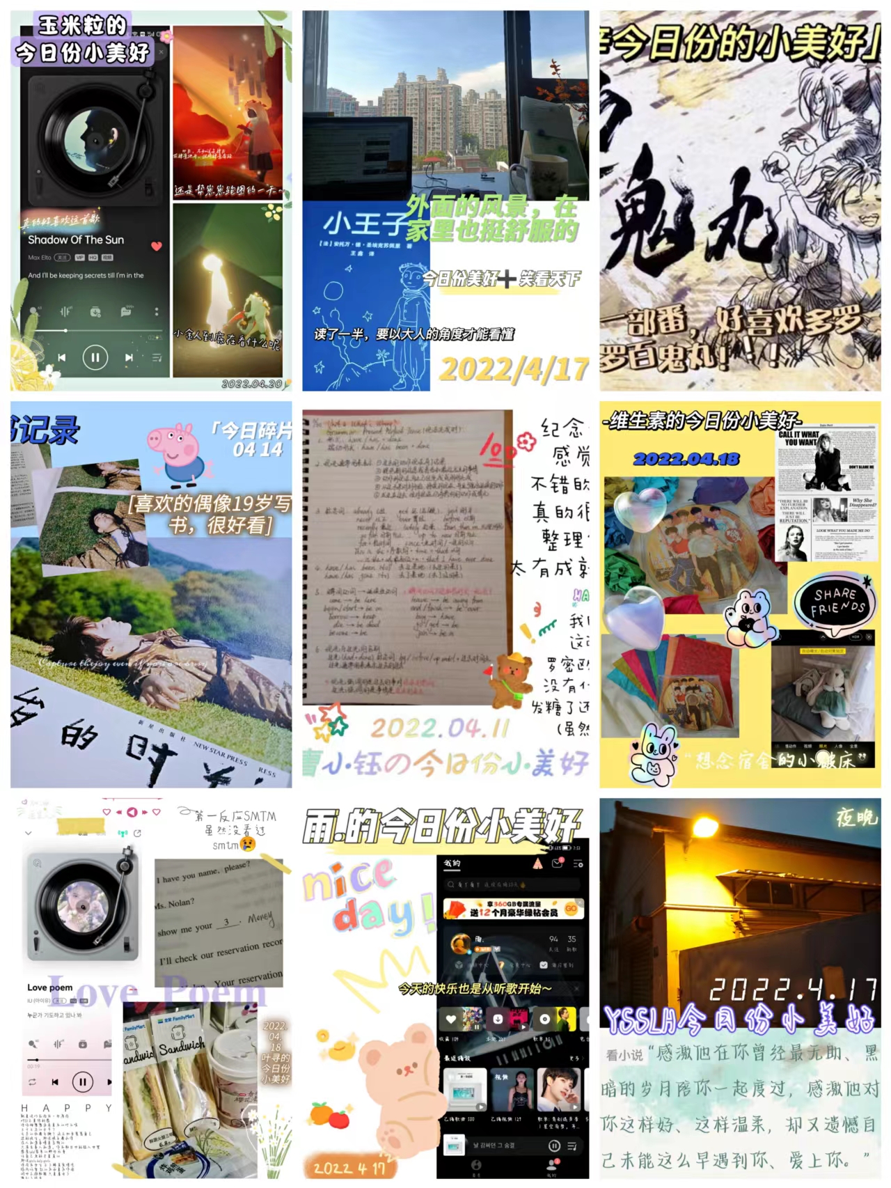 “我每天最期待的事就是参与这个活动,喜欢分享自己的小美好,P成一张图片上传,无聊时看看别人每天都在做些什么,也是一种乐趣。”