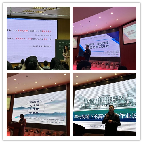 接着,来自晋元高级中学的陈宇静老师做了名为《抓主旨·习方法·创情境·育素养》的报告,结合新课标、新教材带来的挑战,提出了以下解决办法,包括萃取单元内容主旨、匹配史学思想方法、选材设问创设学习情境和任务驱动提升核心素养;来自七宝中学的杨睿老师做了名为《单元视域下的高中历史作业设计》的报告,他从以单元主旨为导向的单元作业、以核心素养为依据的单元作业、以关键能力为目标的单元作业、以学业质量为标准的单元作业、以创设情境为要点的单元作业、以思维品质为层次的单元作业几个方面举例说明高中历史作业的设计。